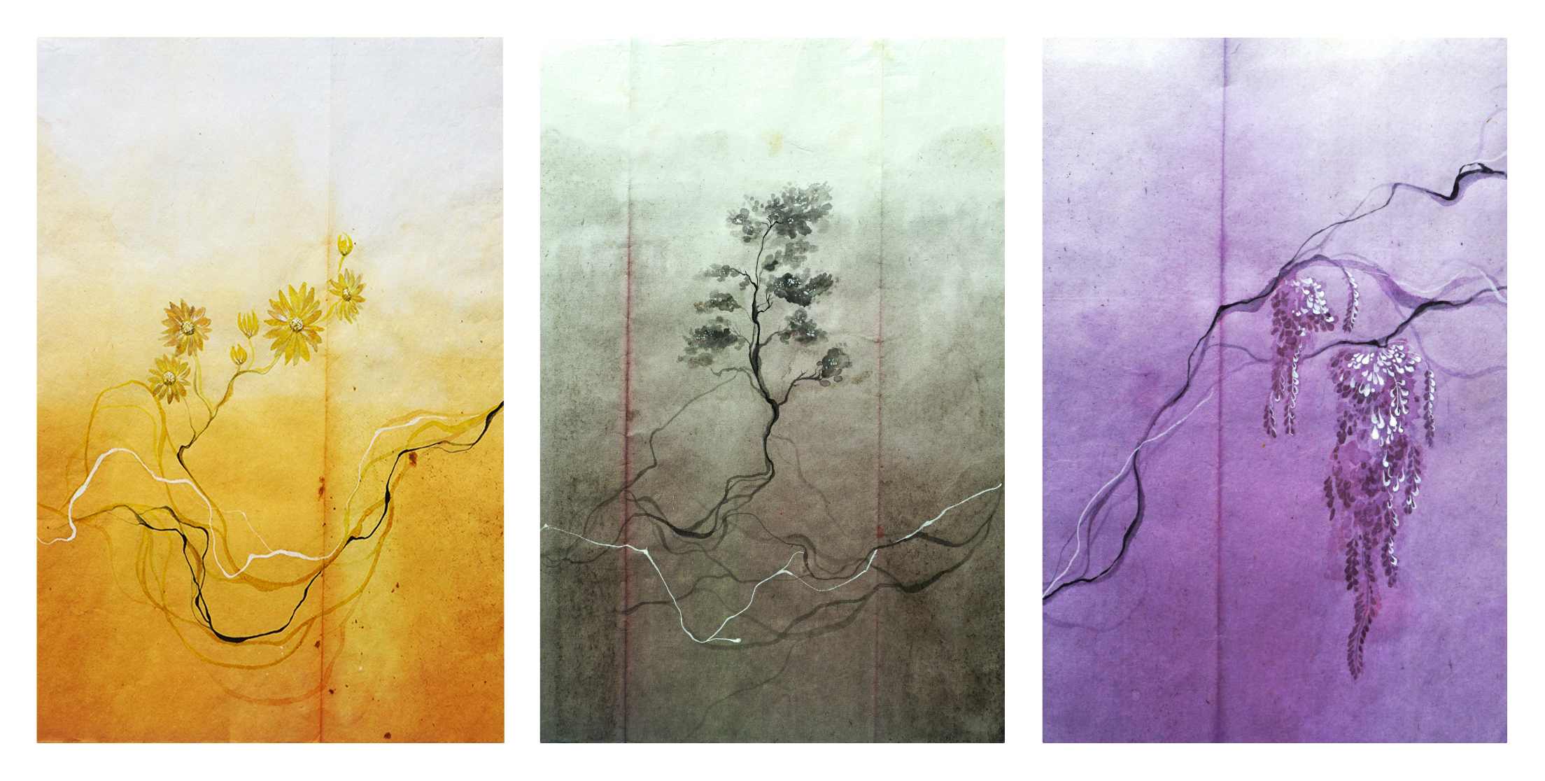 L’opera di Virginia Lorenzetti, invece, si fonda sull’interpretazione in chiave grafica dei segni zodiacali: ad ogni segno è associato un mese dell’anno e ad ogni mese corrisponde un determinato tipo di pianta o fiore. Quest’associazione è legata alle caratteristiche di un antico gioco di carte giapponese, nato nel Cinquecento dall’incontro tra giochi di carte occidentali e orientali, l’Hanafuda: questo termine (“carte dei fiori”) indica più propriamente le carte utilizzate nel gioco. Ogni pianta o fiore incarna nella grafica l’essenza del segno. Le dodici composizioni in serie che compongono l’opera sono prive da simboli o riferimenti archetipici, e instaurano con l’osservatore un contatto semplice e metaforico che rimanda unicamente alla sfera naturale. L’opera ha come principio l’estrema leggerezza e volatilità del segno, accolto dalle tonalità vellutate delle tinture vegetali, che che coincide con la delicatezza dei soggetti interpretati graficamente.