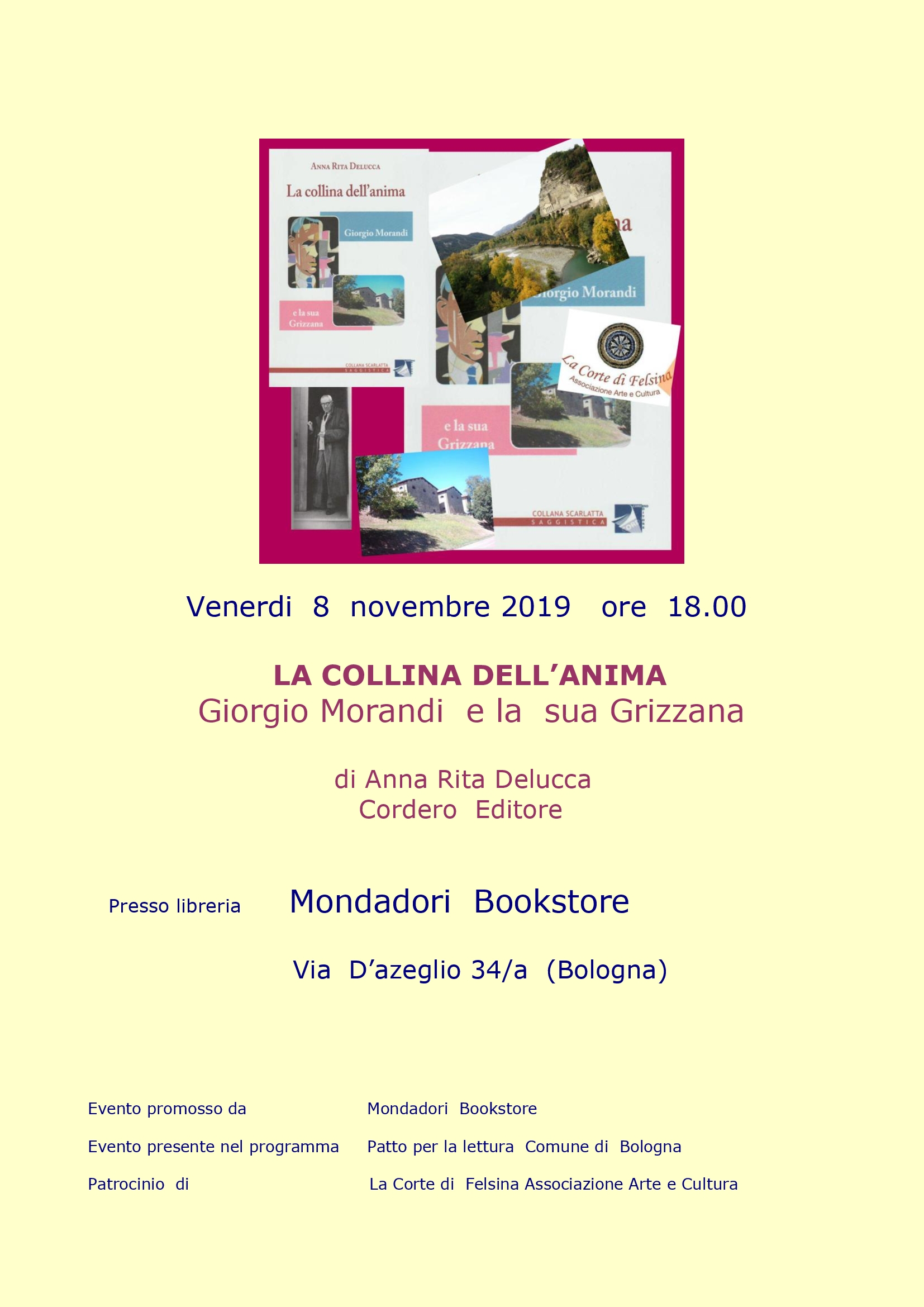 Venerdì 8 novembre 2019 alle ore 18.00 alla libreria Mondadori Bookstore La Corte di Felsina presenta il libro Anna Rita Delucca ‘La collina dell’anima. Giorgio Morandi e la sua Grizzana’ .