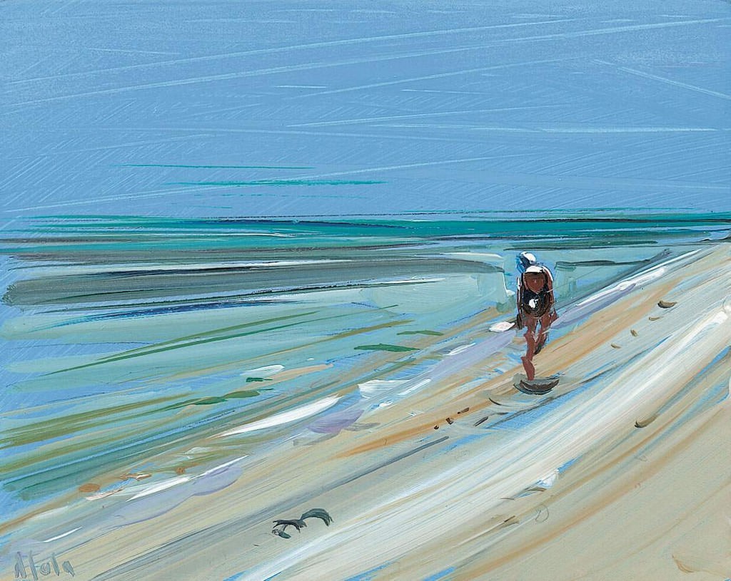 L’occasione della mostra milanese nasce dalla presentazione al pubblico di una duplice pubblicazione. La collaborazione di Anna Sala con le celebri edizioni del Pulcinoelefante – che in oltre 25 anni di attività votati al mondo della poesia hanno siglato quasi 8mila titoli – ha dato infatti vita a due libri legati rispettivamente a due poesie di Antonia Pozzi (1912-1938), dal titolo Mattino e Fine. Alla prima, Anna Sala ha dedicato 40 acquerelli inseriti nelle 40 copie del libro, mentre ispirandosi alla seconda ha realizzato 33 piccoli oli su tavola (cm 8 x10) anch’essi legati ad ogni esemplare numerato dell’edizione. Il risultato di questo omaggio, di grande eleganza e suggestione, è documentato in mostra da una selezione di lavori (circa 80 fra oli e acquerelli) ugualmente ispirati alle immagini poetiche della Pozzi, tutte connesse al tema dell’acqua. Che Anna Sala ha rielaborato in una sequenza di lavori recenti: marine, scorci di lago, animati da bagnanti sotto cieli turchini, o da una fauna variopinta che si scorge oltre i canneti, sulle rive ciottolose di specchi d’acqua cerulei. Atmosfere piene d’aria realizzate dall’autrice con pochi gesti calibrati sulla superficie, in bilico fra l’impressione del momento e i modi della pittura informale.