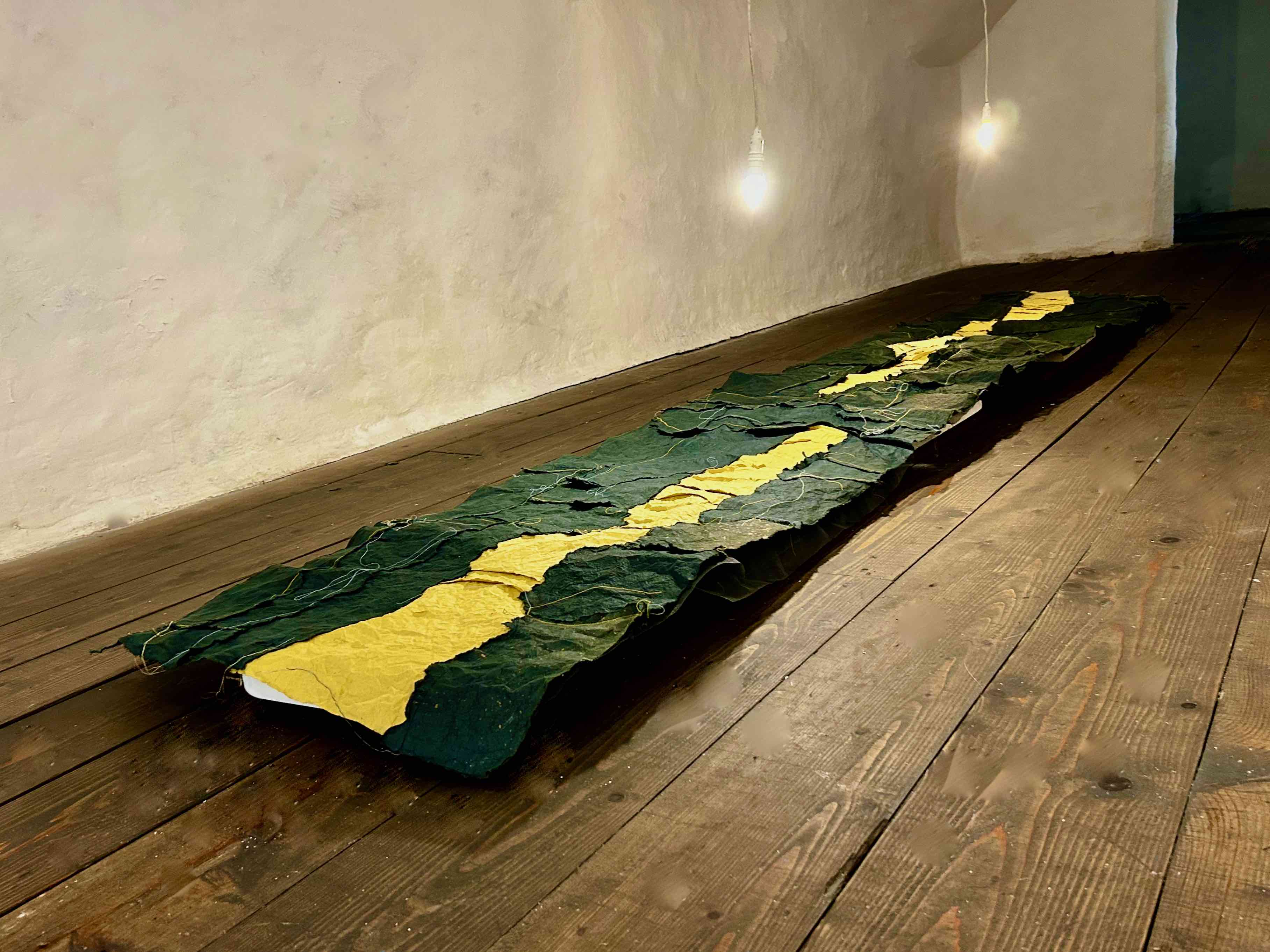 Il suo intervento al Chiasso Perduto si articola in due azioni fondamentali, da una parte scava nel muro per svelare gli strati nascosti, le memorie di altre voci e poi risignificarle in un nuovo paesaggio scultoreo e dall'altra parte raccoglie frammenti di carta, natura e altro per costruire dei paesaggi sospesi che finiscono per sembrare cartografie aeree, esseri organici e non definitivi, come metafora della nostra appartenenza sempre in divenire.