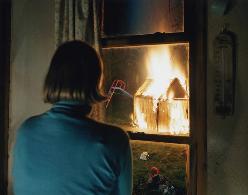 Fuori è buio. Fa freddo, forse. Perché l’albero è spoglio e ha perso quasi tutti i suoi frutti. Sono rotolati a terra, sul prato ancora verde. Un bambino, seduto su una grossa palla di gomma gialla, dà le spalle al mondo e osserva una finestra illuminata. Ma le tende sono tirate e la vista è negata. La sua e la nostra: esiste qualcosa che non si può oltrepassare. Perché non si può capire, comprendere, vedere. Sono barriere, innanzitutto mentali. Sono territori al limite tra la coscienza e l’inconscio. Che si palesano attraverso piccoli indizi, piccole impressioni e rimangono irrisolti. Possono i frutti essere maturi e il loro albero spoglio? E’ un artificio: l’opera di Annabel Elgar rivela, attraverso la costruzione di scenari fittizi e dettagli eloquenti, indizi che chiamano in causa i ricordi e le paure di ognuno. Risvegliano spiacevoli memorie, timori sopiti e non li risolvono. Continuano a vivere nell’immagine e dentro di noi. Perché una delle caratteristiche fondamentali delle fotografie di Annnabel Elgar è il tempo sospeso. Indeterminato. I suoi indizi, metafore evidenti e spesso nefaste, pongono interrogativi e intenzionalmente non li esauriscono, congelandoli nella dimensione atemporale della mente e della fotografia. Solo l’inconscio è chiamato a rispondere. Allo stesso modo, le persone, spesso adolescenti, che popolano le sue immagini rimangono figure indefinite, dei simboli di noi stessi, forse, e di quello che siamo stati: non guardano mai nell’obiettivo, il più delle volte sono di spalle e non ci è dato scoprirne l’identità. Non è un caso che il nero sia il colore predominante nelle immagini della Elgar. La notte, il buio, le ombre profonde senza dettaglio; dove il pensiero razionale lascia il posto a ciò che non lo è. Ai sogni, ai mostri.