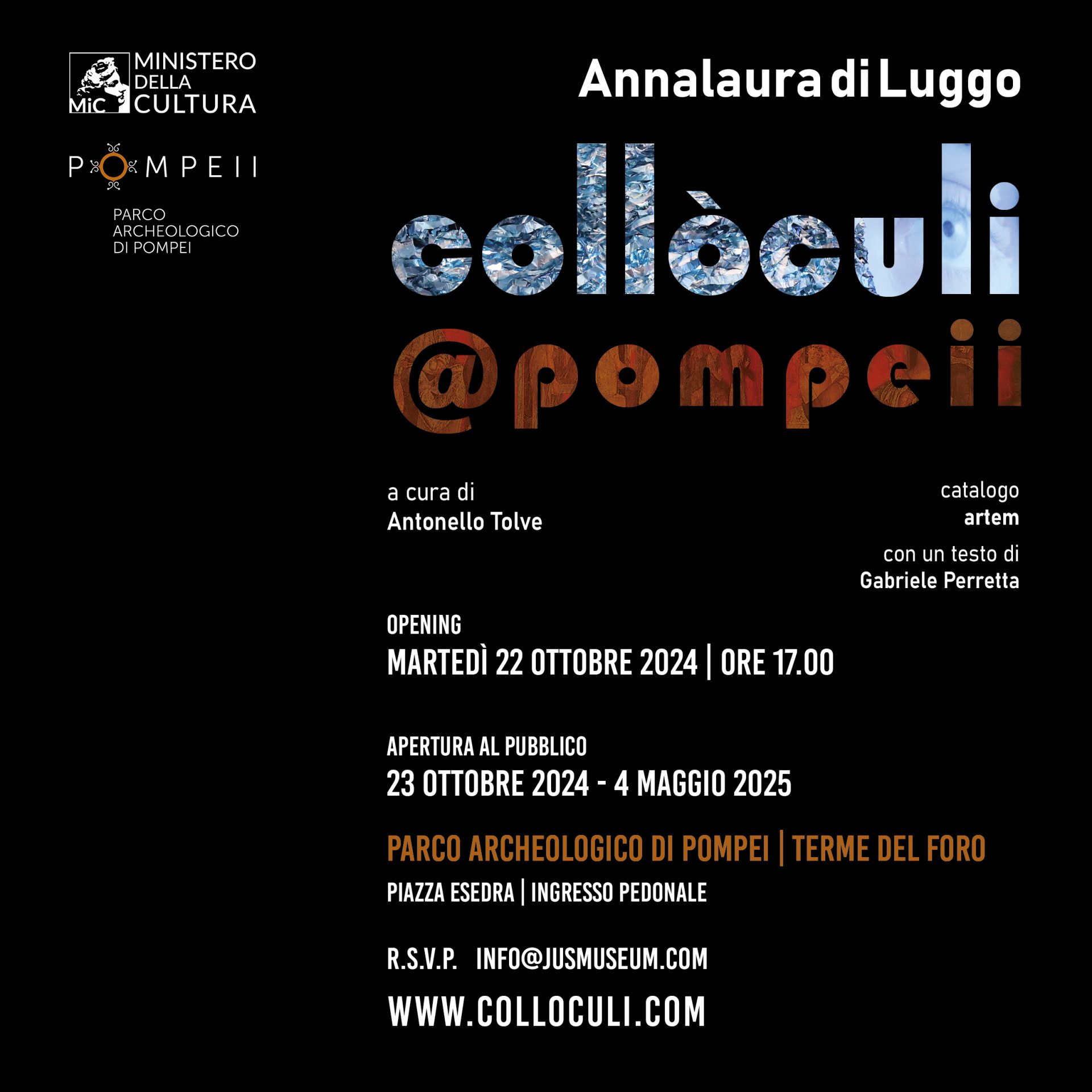 POMPEI (NA). Il 22 ottobre 2024, alle ore 17.00, presso le Terme del Foro del Parco Archeologico di Pompei (Piazza Esedra) si terrà l’opening di Collòculi @Pompeii di Annalaura di Luggo, a cura di Antonello Tolve, con il patrocinio del MiC.