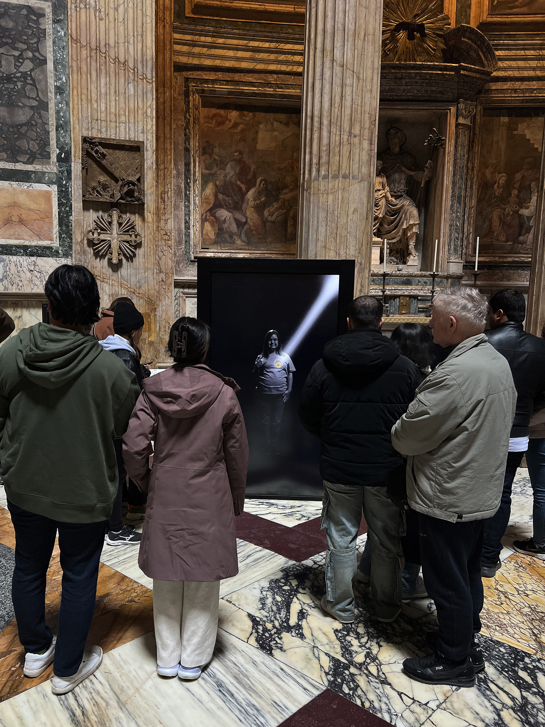 Il percorso si sviluppa attraverso cinque Porte Sante ideali su cui bussare concretamente. L'interazione segna le tappe che il fruitore è invitato a compiere attraverso l'incontro con persone con disabilità provenienti dai 4 angoli del mondo. Sono figure che non comunicano attraverso le parole, ma sono il viatico di un'energia luminosa che diventa voce e linguaggio. In “Oculus-Spei,” la luce non è solo un elemento estetico, ma un ponte tra le diversità, un mezzo per rendere ciascuno protagonista di un viaggio interiore in cui il confine tra chi osserva e chi è osservato si dissolve, rendendo tutti parte di un’unica esperienza umana che celebra il valore dell’inclusione. Il viaggio culmina nella quinta porta, quella del Carcere di Rebibbia, scelta da Papa Francesco come Porta Santa aggiuntiva del Giubileo. Qui il visitatore non è più solo spettatore, ma viene coinvolto in un’esperienza interattiva. Un sistema tecnologico di telecamere in real time proietta l'osservatore nella scena ponendolo di fronte a sé stesso e dietro delle sbarre. Quelle sbarre non rappresentano solo una reclusione fisica, ma sono anche gabbie interiori che limitano la nostra esistenza: paure, pregiudizi, ostacoli invisibili che ci rendono prigionieri. Anche in questo caso ad essere protagonista un raggio di luce che colpisce l’osservatore "liberandolo". Lentamente la luce entra nello spazio, dissolve le sbarre e scioglie quel senso di prigionia. In questo spazio trasformativo, il fruitore diventa parte attiva di un percorso di riscatto che lo conduce a una nuova consapevolezza. La luce, che accompagna l’intera esperienza di Oculus-Spei, qui si manifesta nella sua funzione più profonda: non solo illumina, ma trasfigura e libera, rendendo visibile la possibilità di una speranza concreta.