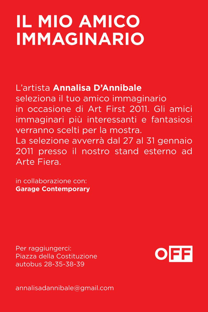 L’artista Annalisa D’Annibale seleziona il tuo amico immaginario in occasione di Art First 2011. Gli amici immaginari più interessanti saranno lo spunto per una nuova mostra. Il progetto OFF è un modo giocoso ed ironico per avvicinare il pubblico al lavoro artistico di Annalisa D’Annibale.