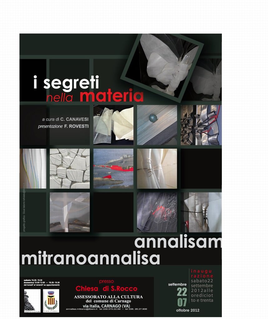 “… il titolo di questa rassegna, “I segreti nella materia” - una sorta di riassuntiva in ambito tridimensionale del percorso decennale (2002-2012) di Annalisa Mitrano -, mette in risalto una ricerca che rimanda a memorie esperienziali spazianti dai territori intimi della coscienza a quelli più profondi dell’inconscio. “
