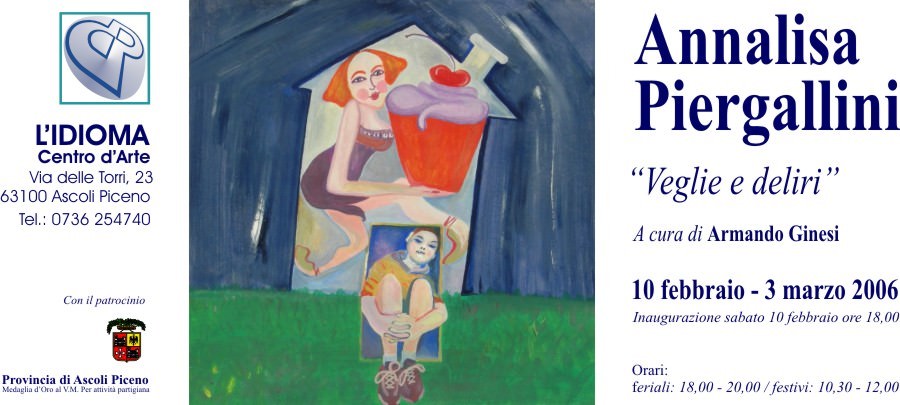 Che cosa avviene durante queste “Veglie”? Le pulsioni dell'anima si affacciano tutte insieme sulla soglia della coscienza; si affollano e vanno oltre lambendo la ragione ma senza farsi imbrigliare. Il risultato visivo è la connessione a-logica degli elementi, la loro modificazione morfologica, la rinuncia, parziale o totale, al principio del vero ma anche del verosimile, per trasformarsi in realtà diversa, nuova, senza regole, estranea al reticolo spazio-temporale. Come se fossero pensieri in assoluta libertà che vagolano in un proprio spazio speciale e che l'occhio-mente di Annalisa Piergallini rifacendosi sostanzialmente ai postulati dottrinari e alle metodiche surrealiste vede, registra e trascrive sopra il piano di proiezione offerto dalla tela o da qualsiasi altro tipo di supporto. Così facendo l'artista penetra all'interno del regno della fantasia e ne diviene cittadina a pieno titolo.