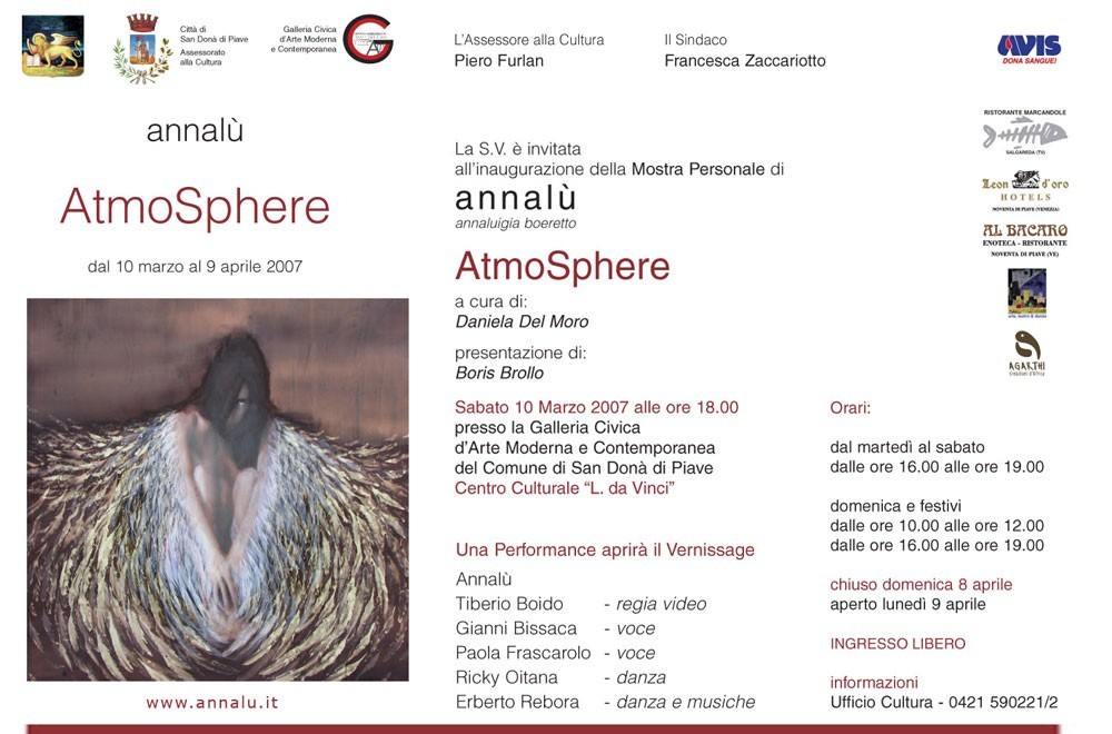 San Donà di Piave Venezia Sabato 10 Marzo 2007: negli spazi della Galleria Civica d’Arte Moderna e Contemporanea, Piazza Indipendenza, la Città di San Donà di Piave e l’Assessorato alla Cultura presentano in anteprima AtmoSphere, Mostra Personale dell’Artista Annalù (Annaluigia Boeretto) che verrà inaugurata alle ore 18.00.