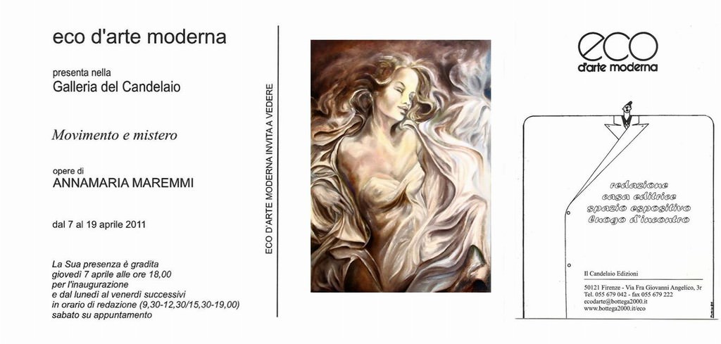 Si inaugura giovedì 7 aprile alle ore 18.00, alla Galleria del Candelaio di Firenze (Via Frà G. Angelico 3r), "Movimento e mistero" con dipinti e disegni di Annamaria Maremmi, mostra organizzata in collaborazione con la rivista "Eco d'arte moderna". Visitabile fino al 19 aprile.