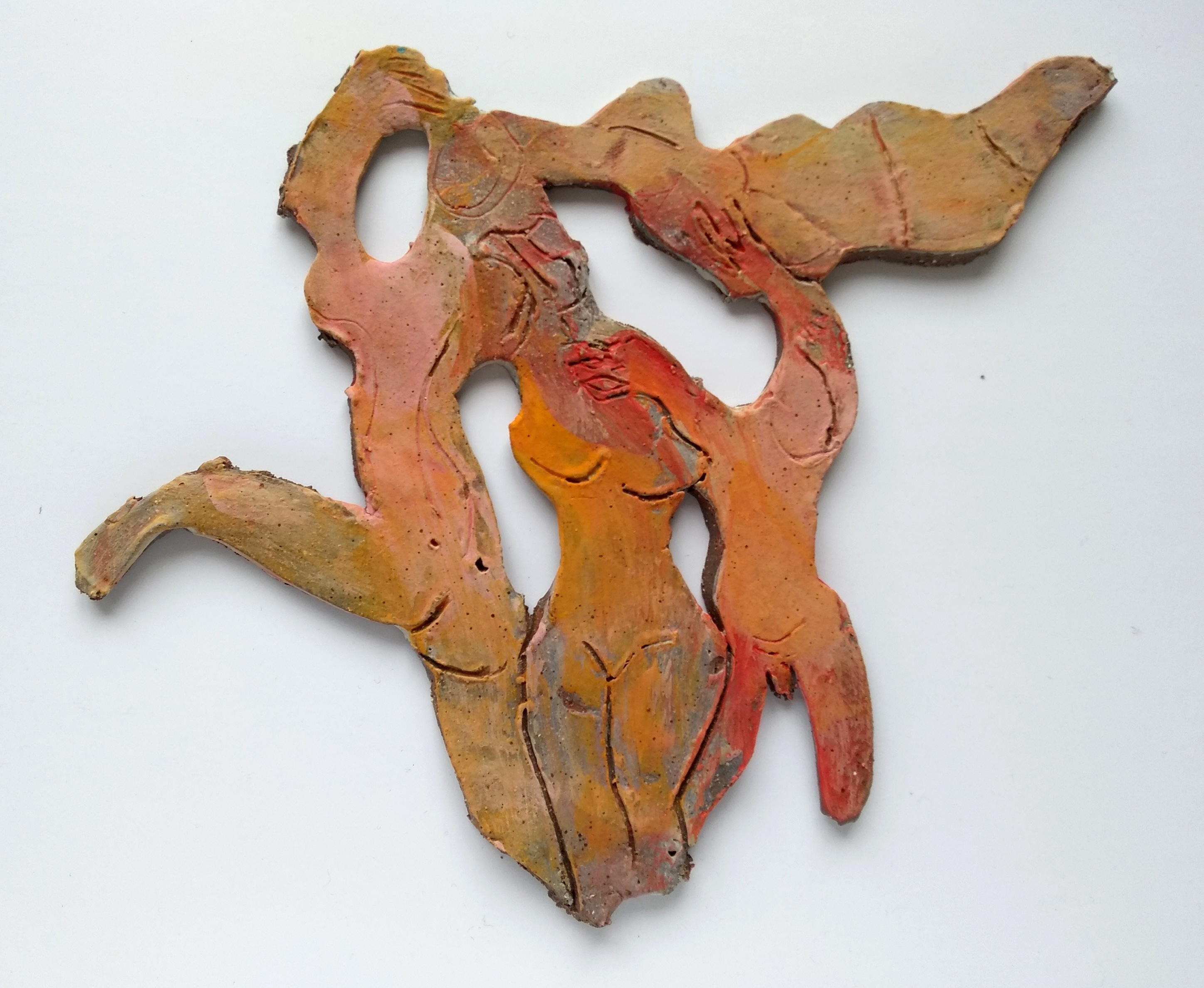 La mostra prosegue al piano inferiore, dove lo spirito vitale dei personaggi si incarna nella terra modellata e dipinta con tocchi veloci e vigorosi. Figure che sembrano rubate ai vasi e agli affreschi classici, etruschi o greci, e che, grazie anche ad una tavolozza più aggiornata, assumono una vita nuova e un carattere più moderno. Appese sulle pareti bianche, queste figure sottili, sono un’ulteriore riflessione sulla pittura, sul suo destino e sulla sua importanza.