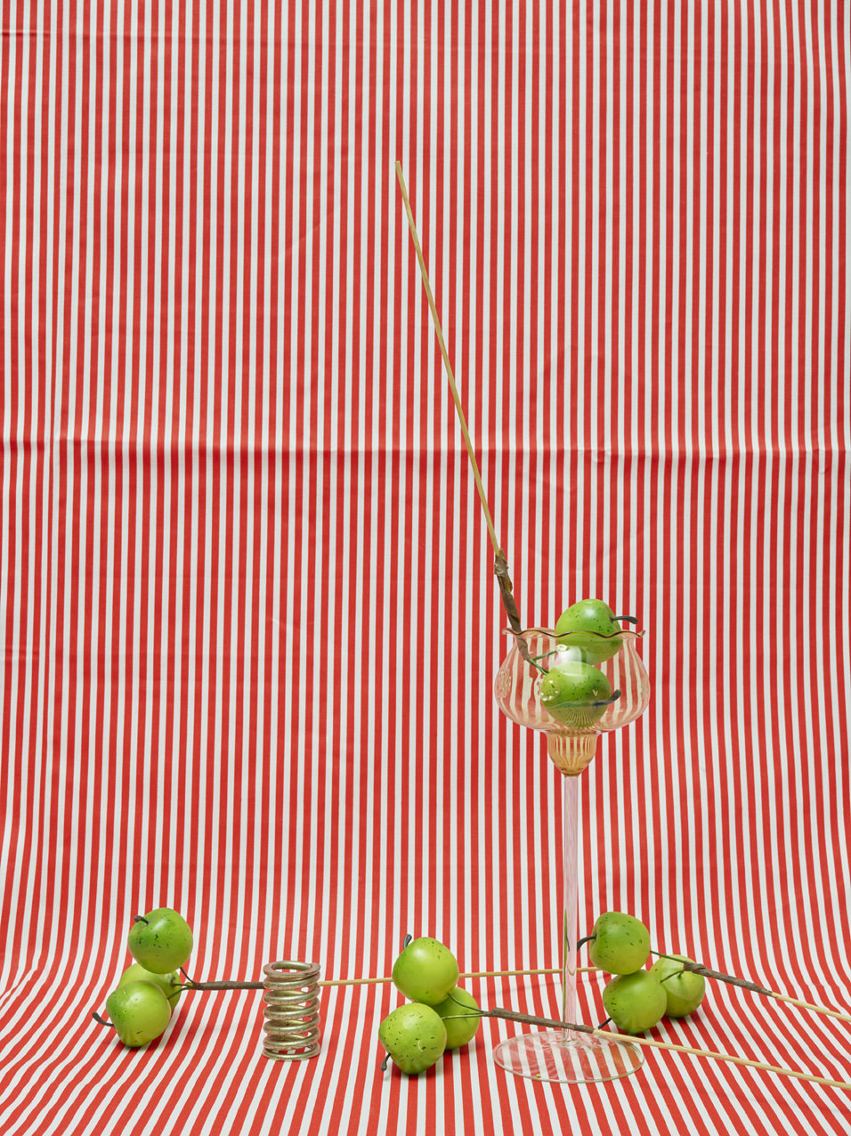 Con Proposal for Knots Kelm si allaccia al suo uso di sfondi di tessuto stravaganti e insoliti, intrepretando il design tessile come una forma di linguaggio visuale e una rappresentazione del commercio globale. L'immagine presenta un tessuto il cui design riprende le istruzioni su come fare i nodi. In Good Morning un tovagliolo aperto decorato a stampa ci saluta quattro volte in inglese, francese, spagnolo e tedesco. I quattro soli splendono luminosi dietro alle parole. Il tovagliolo è coperto da piccoli boccioli di fiore e da uno spesso cavo nero, che allude alla costruzione tecnica dell'immagine in studio. I tessuti di sfondo di Apples, Straws and Stripes e Red Stripes sembrano decisamente noncuranti - in Red Stripes persino le pieghe sono al centro dell'attenzione, diventando un motivo a se stante.