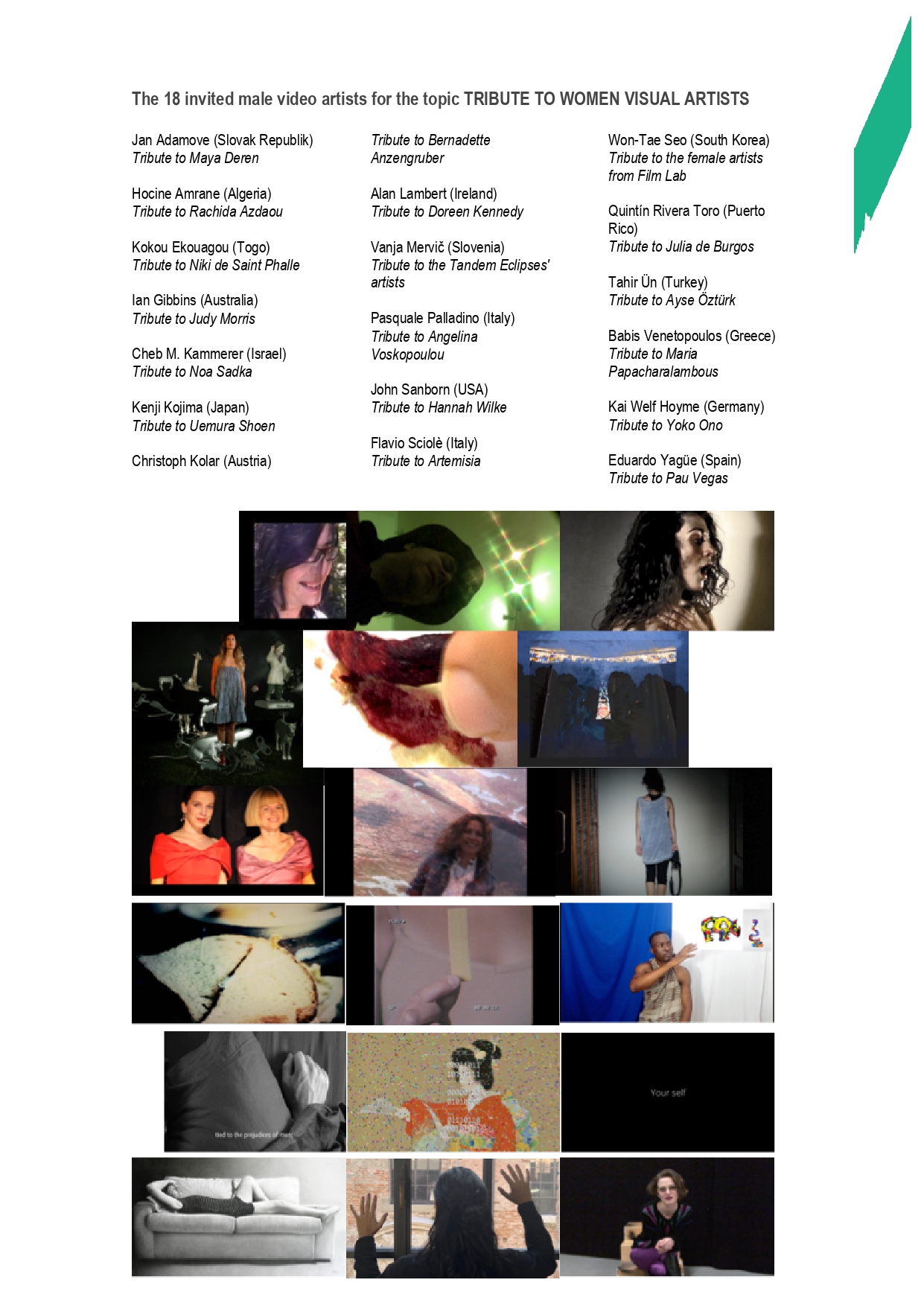 Questi i nomi dei 18 artisti: Quintín Rivera Toro (Puerto Rico), Won-Tae Seo (South Korea), Alan Lambert (Ireland), Hocine Amrane (Algeria), Cheb M. Kammerer (Israel), Babis Venetopoulos (Greece), Vanja Mervič (Slovenia), Tahir Ün (Turkey), Eduardo Yagüe (Spain), Flavio Sciolè (Italy), John Sanborn (USA), Kokou Ekouagou (Togo), Pasquale Palladino (Italy), Christoph Kolar (Austria), Ian Gibbins (Australia), Jan Adamove (Slovak Republik), Kai Welf Hoyme (Germany), Kenji Kojima (Japan).