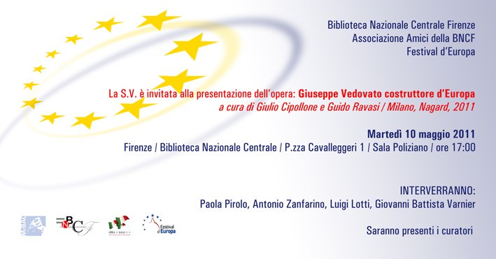 Inoltre martedì 10 maggio, alle 17,00 in Sala Poliziano, in collaborazione con l'Associazione Amici della Biblioteca, sarà presentata l'opera Giuseppe Vedovato costruttore d'Europa, a cura di Giulio Cipollone e Guido Ravasi, Milano Nagard 2011. Interverranno: Paola Pirolo, Antonio Zanfarino, Luigi Lotti e Giovanni Battista Vernier. Saranno presenti i curatori.