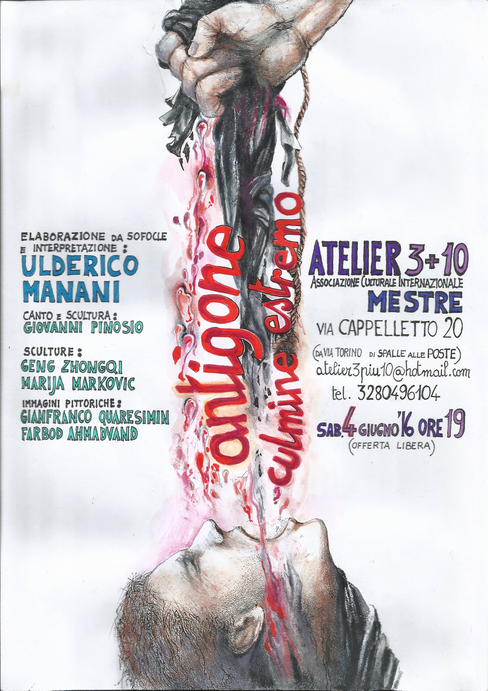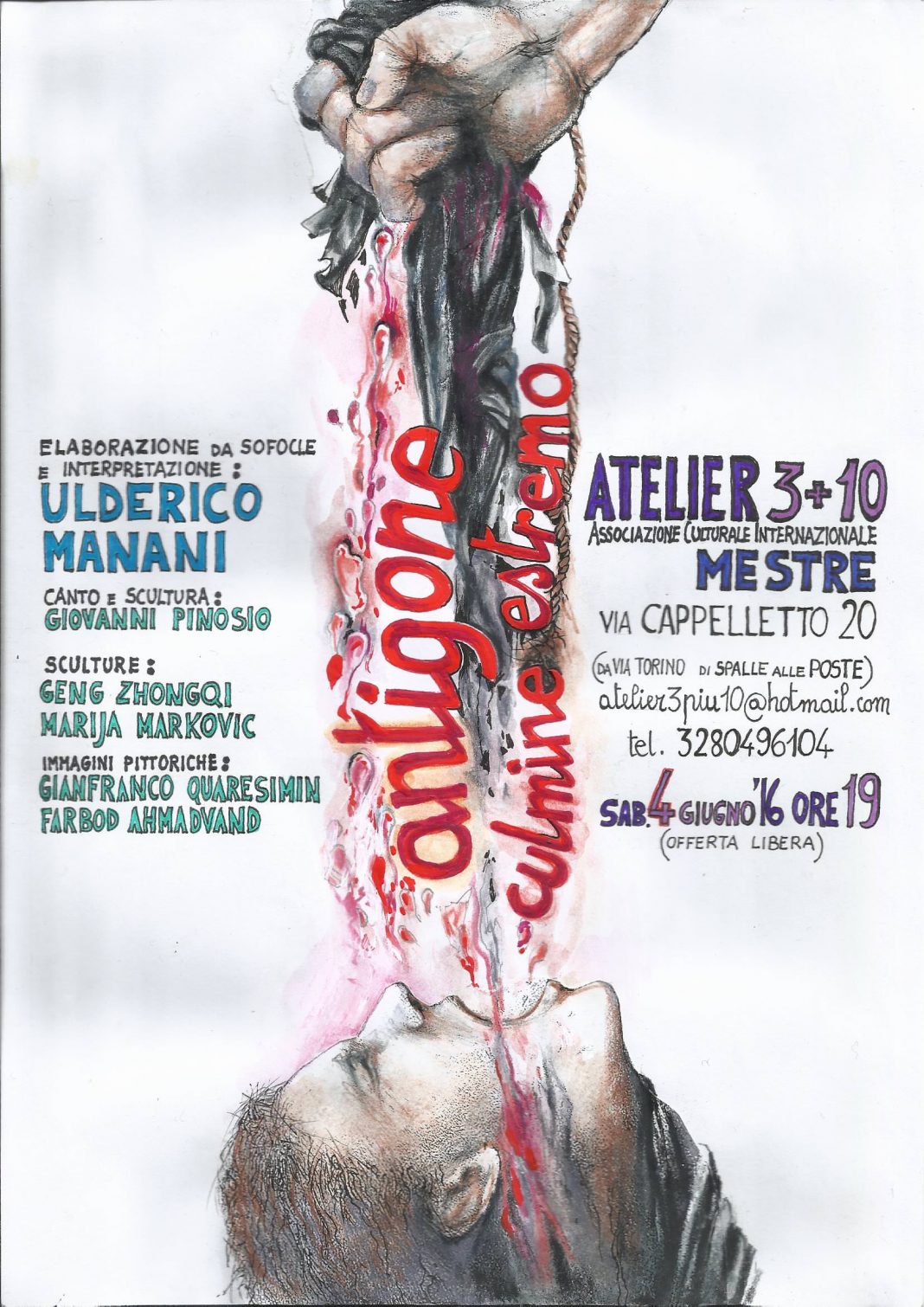 Teatro di riflessione . Elaborazione dal testo Antigone di Sofocle ed interpretazione di ULDERICO MANANI con la partecipazione di artisti contemporanei anche stranieri autori di sculture ,immagini pittoriche e voce
