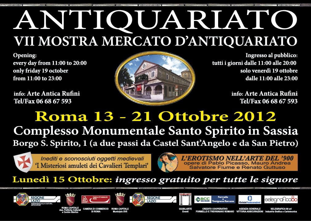 La settima edizione della nota manifestazione Antiquari Nella Roma Rinascimentale si svolgerà da sabato 13 a domenica 21 ottobre 2012, presso la splendida location del Complesso Monumentale Santo Spirito in Sassia, in via di Borgo S. Spirito 1, a Roma, nei pressi di S. Pietro e di Castel S. Angelo.