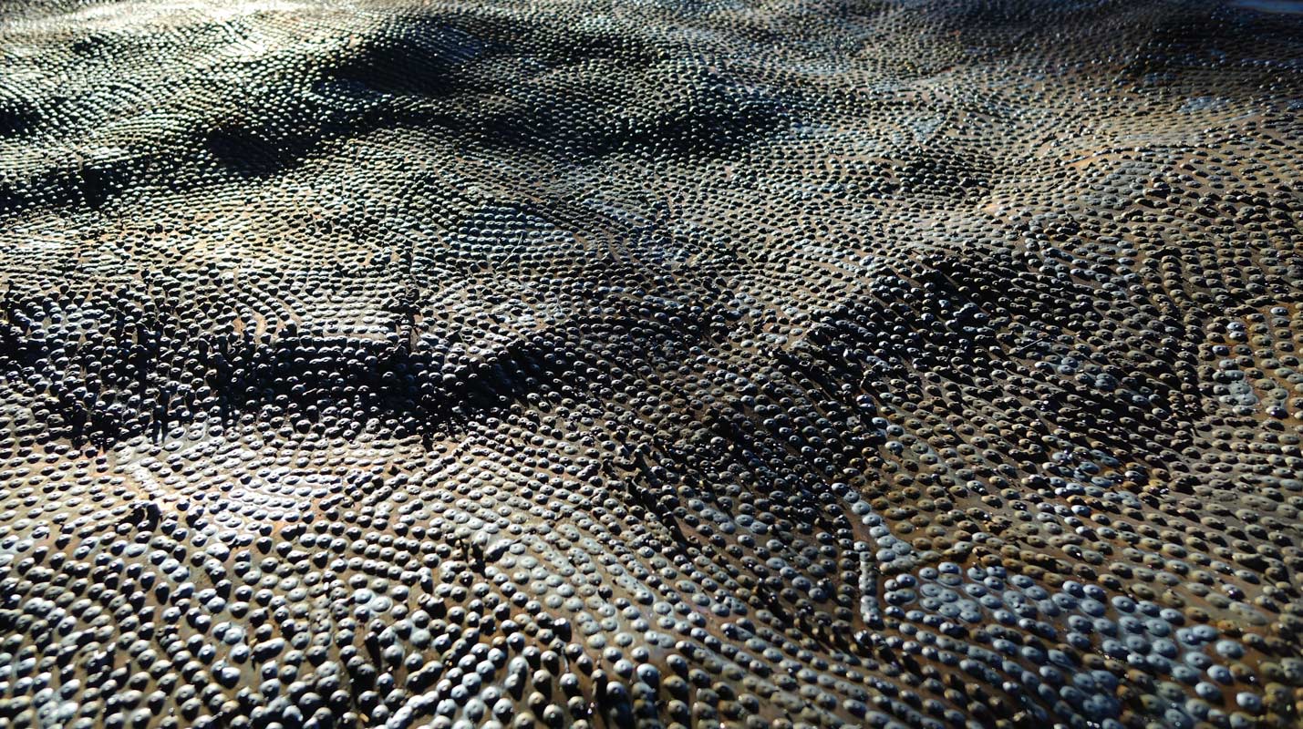 Lastre d’acciaio che diventano grandi opere informali, dove la materia evoca involontarie memorie di paesaggi, involontarie geometrie, involontarie costellazioni. 200000 saldature, un’installazione a dimensioni ambientali di grande impatto nella minima galleria di via Unione.