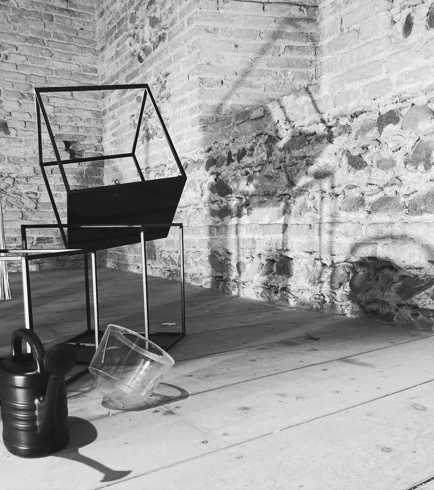 L’ombra, una forma in cui, improvvisamente, s’inciampa, indipendentemente da chi o cosa l’abbia generata; infatti tra le mura della torre campanaria di Castellaro Lagusello, nel progetto di “Una Torre per l’Arte”, si deve camminare, e salire, e riscendere, con estrema cautela; non a causa dell’usura di scalini o ciottoli sconnessi, ma perché bisogna stare attenti, come quando si giocava da bambini a non pestare le ombre, per timore reverenziale di rimanerci dentro per sempre.