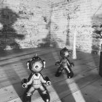 L’ombra rinvia all’individuo più per la sua prossimità del corpo che per la reale rassomiglianza. Delinea un contorno allusivo, infatti si dice che durante il sonno, l’ombra, può diventare tanto instabile e fluttuante da potersi, per qualche breve istante, staccare e barcollare per pochi passi, come fosse in preda a vertigini. Si arriva ad Artificio, un’altra installazione composta di oggetti recuperati di varia natura: chincaglierie d’uso domestico o d’arredamento, che sono state uniformate da una verniciatura color nero. Ma se la loro forma viene annullata da un piattume cromatico, le luci che vengono proiettate su questi oggetti gli danno un nuovo soffio vitale; vibrano allungandosi tra pavimento e parete: così lo spremiagrumi assume le dimensioni e le sembianze di un palazzo, dei giocattoli trasfigurano in persone adoranti con le braccia al cielo, il mobiletto di design diventa una proiezione ortogonale disegnata con squadra e compasso. Anche i visitatori diventano parte dello spettacolo di ombre, coi loro spostamenti nello spazio, in controluce, sono dei veri e propri figuranti del teatro naturale.