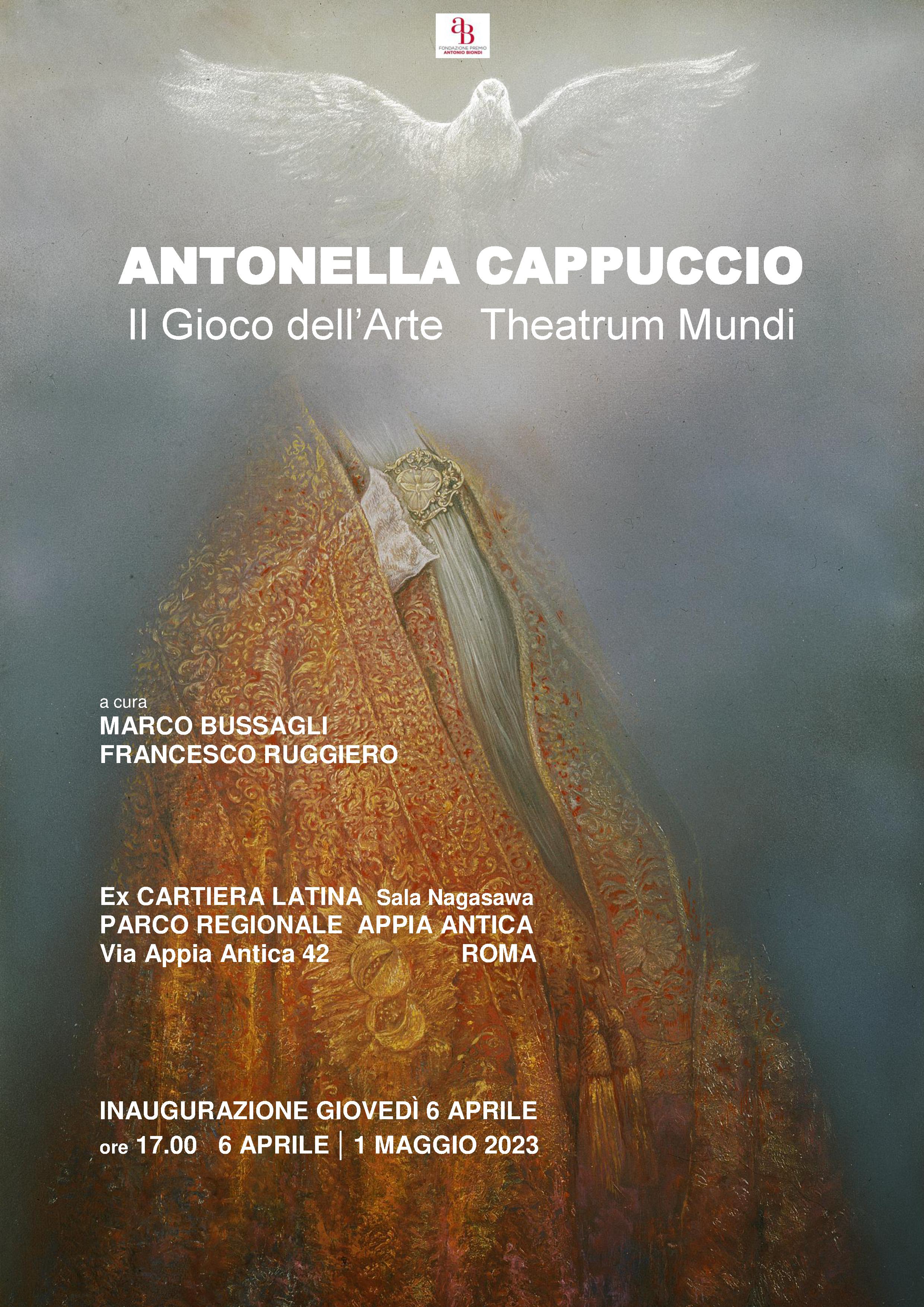 Si inaugura a Roma Giovedì 6 Aprile 2023 dalle ore 17.00, allestita nella Sala Nagasawa dell’Ex Cartiera Latina nel Parco Regionale dell’Appia Antica, la Mostra personale di Antonella Cappuccio, curata da Marco Bussagli e Francesco Ruggiero, dal titolo Il Gioco dell’Arte Theatrum Mundi.