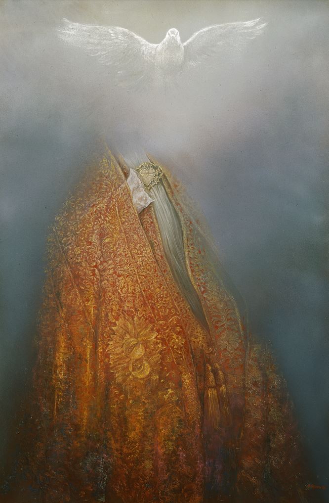 Non è un caso che il suo Apparentia atque essentia Mundi del 2004 sovrapponga gli abiti al planisfero che funge da sfondo e supporto insieme dell’effimero dove è l’abito vuoto ad aver vita autonoma, senza alcun bisogno di qualcuno che l’indossi. Allo stesso modo, non stupisce che il suo Autoritratto del 2006 lasci il campo libero alla tuta da lavoro dell’Artista, vuota, dove sono i colori ad olio, a tempera o quelli acrilici, che l’hanno schizzata, ad essere i protagonisti del racconto, mentre la notazione fisionomica del volto scompare nella delicatezza dello sfondo.