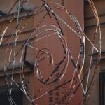 O: frammenti di campionature tessili (anni 80/90), intrecciati/cuciti su struttura spiraliforme in tondino di ferro