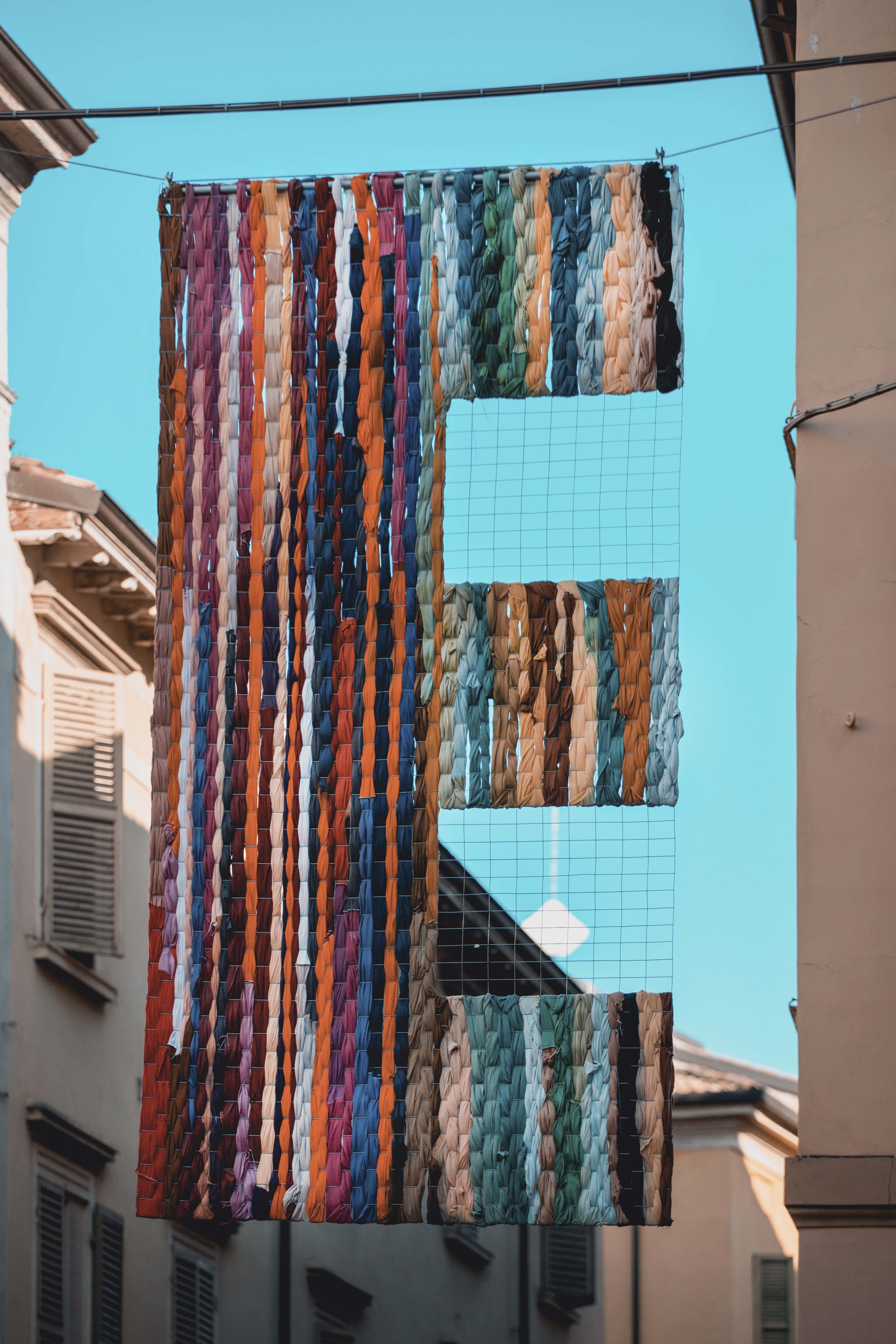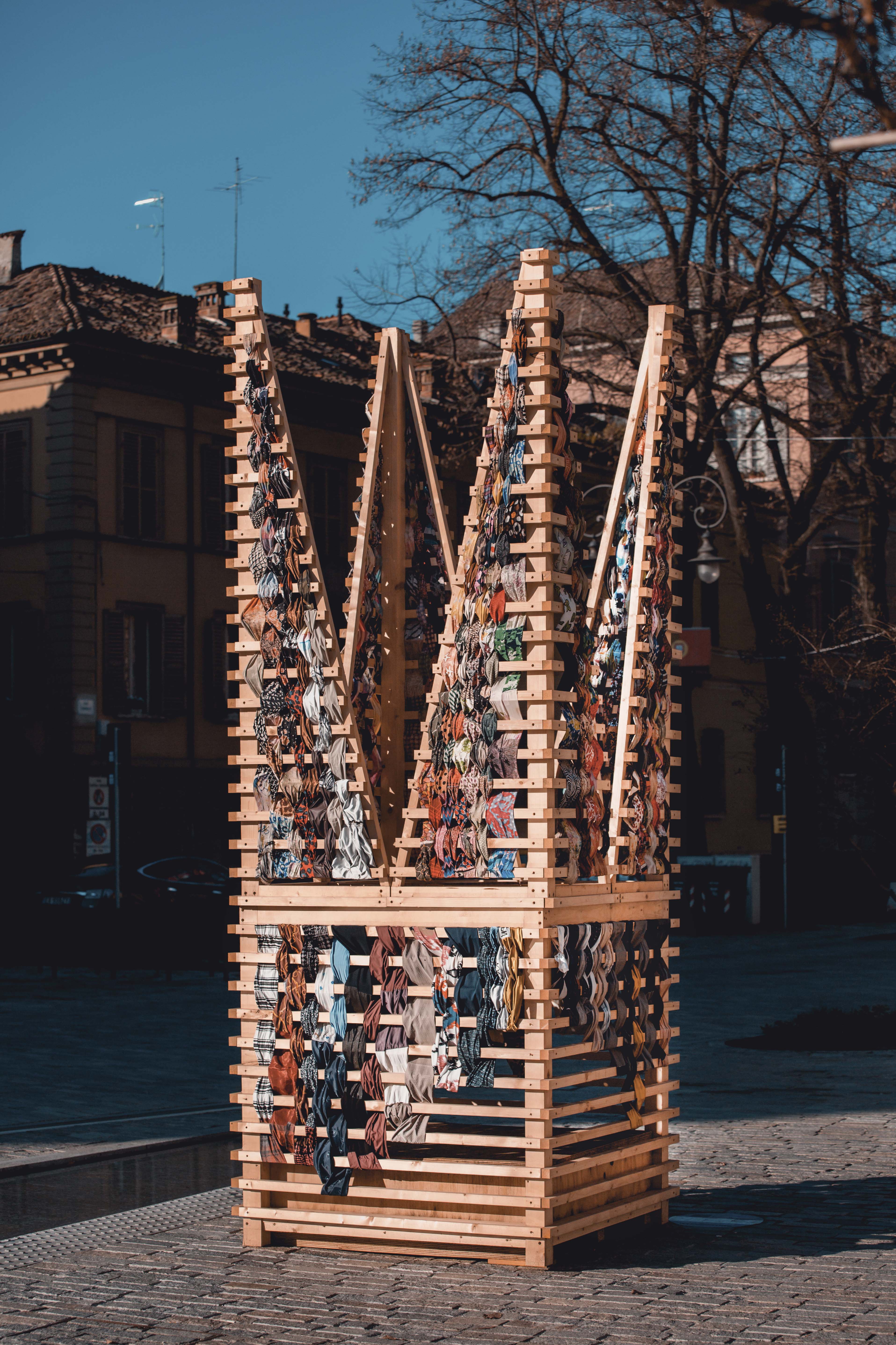 Ornamento è l’installazione urbana che collega le due sedi espositive della mostra What a Wonderful World, Palazzo Magnani e i Chiostri di San Pietro, definendo un itinerario puntiforme di opere tessili, le lettere appunto che formano la parola “ornamento”.
