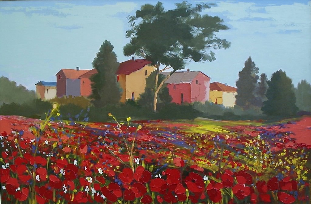 Campi, cieli, fiori, alberi e casolari sono elementi di una composizione dove il colore è sviluppato come un artificio finalizzato a un movimento che rivela l’essenza della natura.
