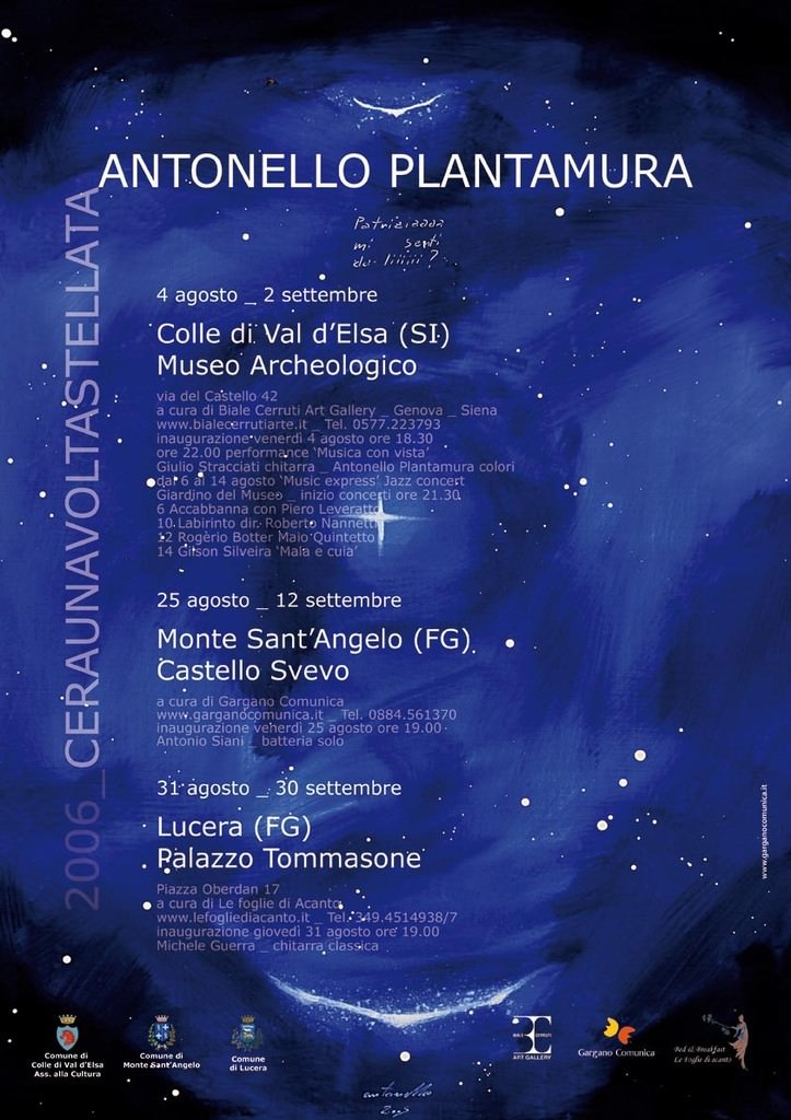 Ceraunavoltastellata, il titolo di questa mostra itinerante, lega l’attuale fase artistica del pittore, “la volta stellata”, con le tre sedi espositive: splendidi gioielli del passato (il tema del “c’era una volta”). Inoltre a Colle Val D’elsa l’artista ha dipinto una volta stellata di 10 metri di lunghezza sfruttando una volta a botte del Museo Archeologico.