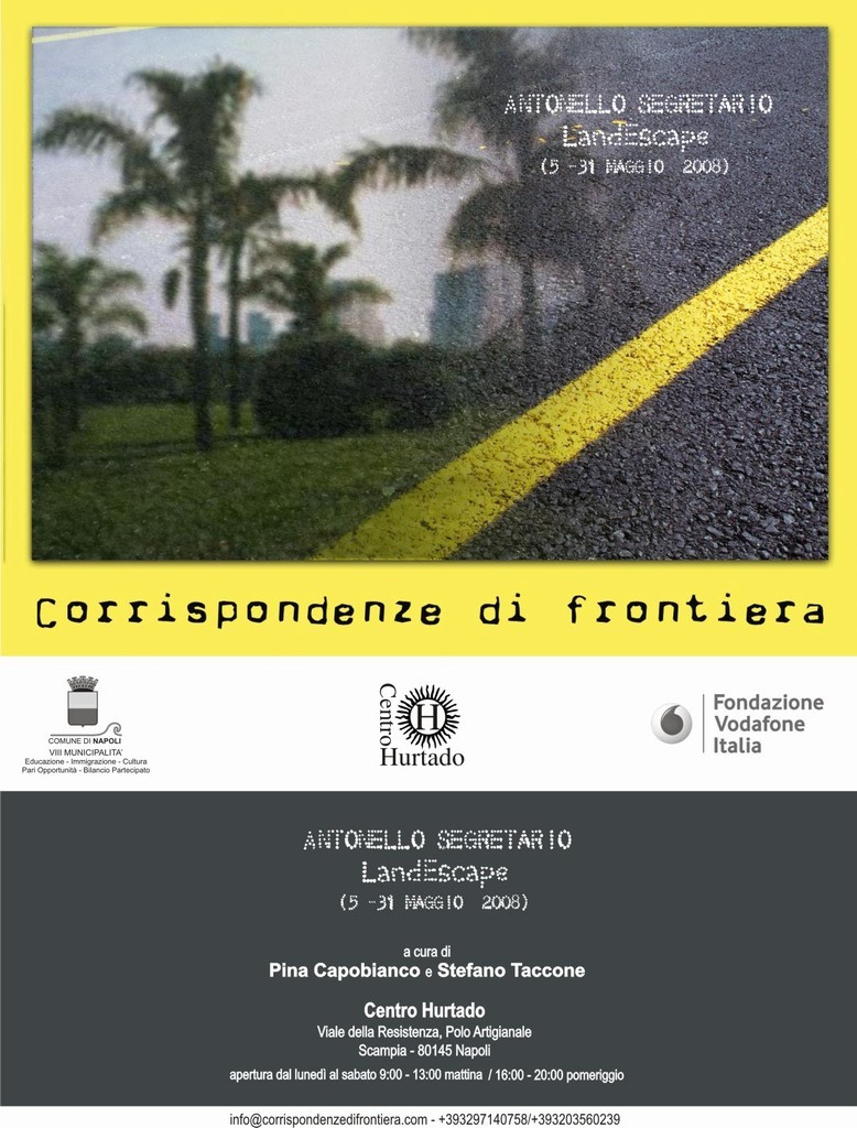 At the Centro Hurtado (Viale della Resistenza, Polo Artigianale - Scampia, Napoli), for the cycle “Corrispondenze di frontiera”, curated by Pina Capobianco and Stefano Taccone, opens “LandEscape”, solo show of Antonello Segretario, the first of the eight artists invited by turn to elevate the historical, political, social and economic context to primary substance of their work. The exhibition will be opened until 31th mayand will keep to the following hours: since Monday to Saturday 9:00 a. m. – 1:00 p.m./4:00 p.m. – 8:00 p. m.