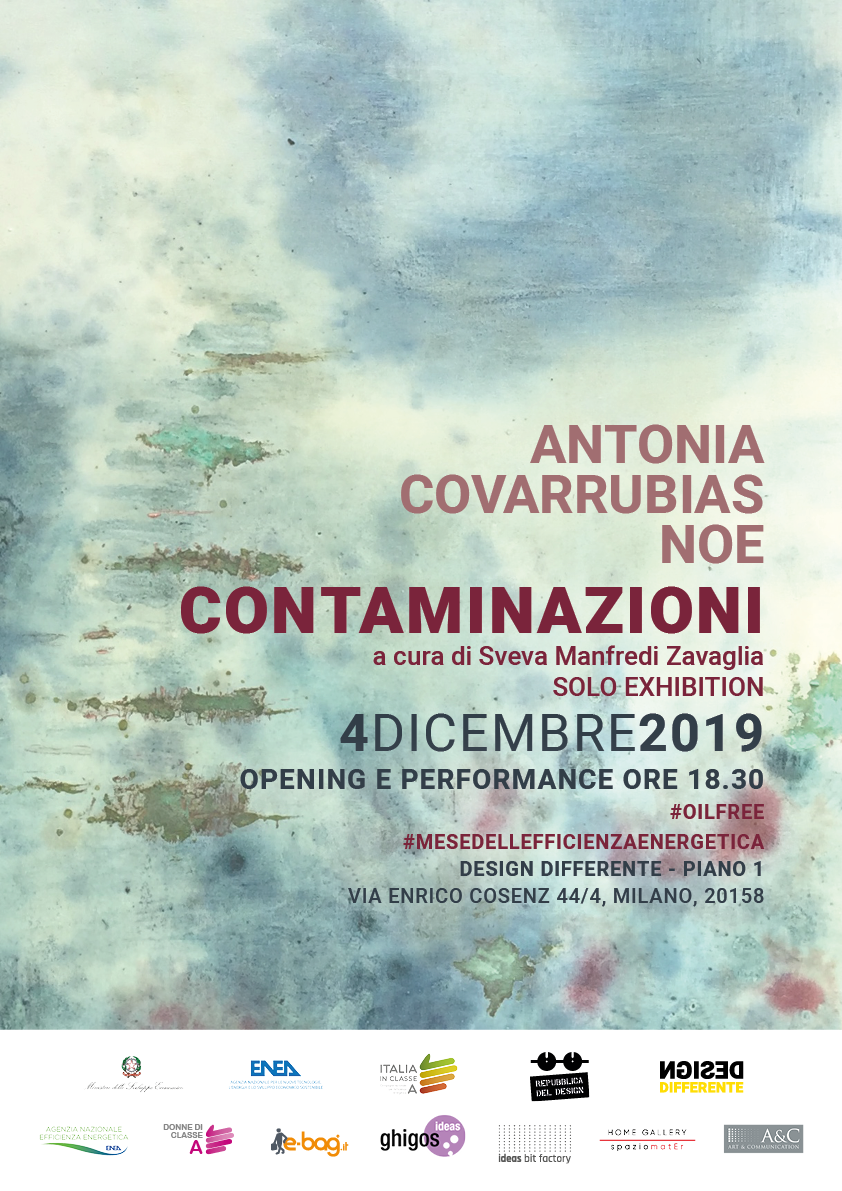 Mercoledì 4 dicembre dalle ore 18.30 , in via Cosenz 44/4 a Milano , nello spazio espositivo di Design Differente - nell’ambito della Campagna nazionale Italia in Classe A, in collaborazione con il Dipartimento Unità Efficienza Energetica dell’ENEA – si inaugura la mostra personale “Contaminazioni” della pittrice cilena Antonia Covarrubias Noe. La mostra, a cura di Sveva Manfredi Zavaglia, si inserisce nelle attività espositive di “OIL FREE”, la rassegna costruita sulla multidisciplinarietà per raccontare la resilienza e la rigenerazione urbana attraverso l’arte contemporanea e la ricerca scientifica nel percorso di transizione energetica. Il fine è rappresentare la sostenibilità energetica attraverso i linguaggi dell’Arte Contemporanea, della Tecnologia, del Design, accompagnando tutti verso comportamenti e scelte consapevoli, per offrire risposte concrete e innovative alle sfide dei cambiamenti climatici all’ interno delle città metropolitane, nell’era del post petrolio.