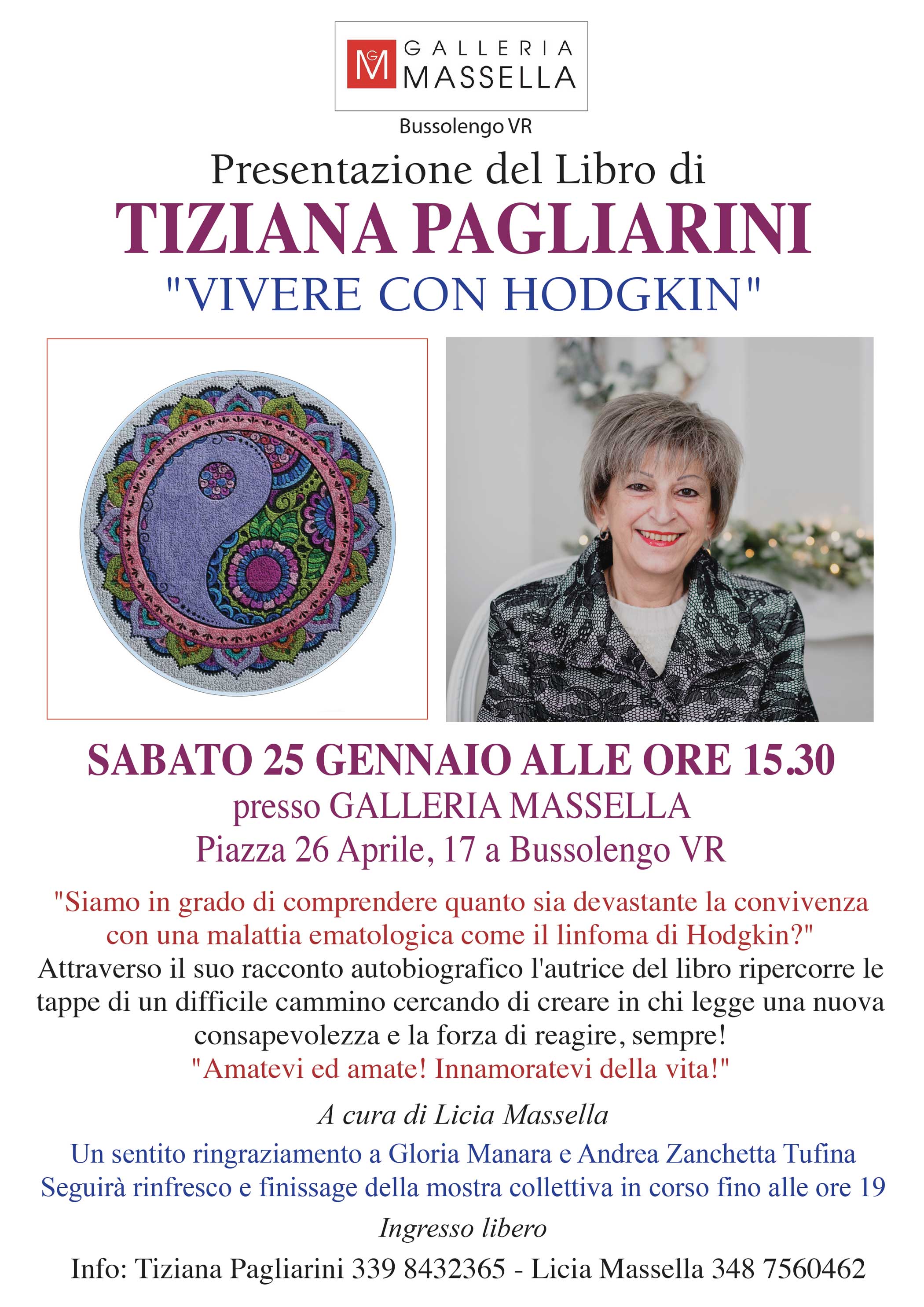 Da sabato 18 gennaio ore 17.30, giorno di inaugurazione con la presenza dell'Assessore alla cultura del Comune di Bussolengo VR Valeria Iaquinta, a sabato 25 gennaio ore 15.30 con la presentazione del libro di Tiziana Pagliarini "Vivere con Hodgkin" e finissage della mostra fino alle ore 20.