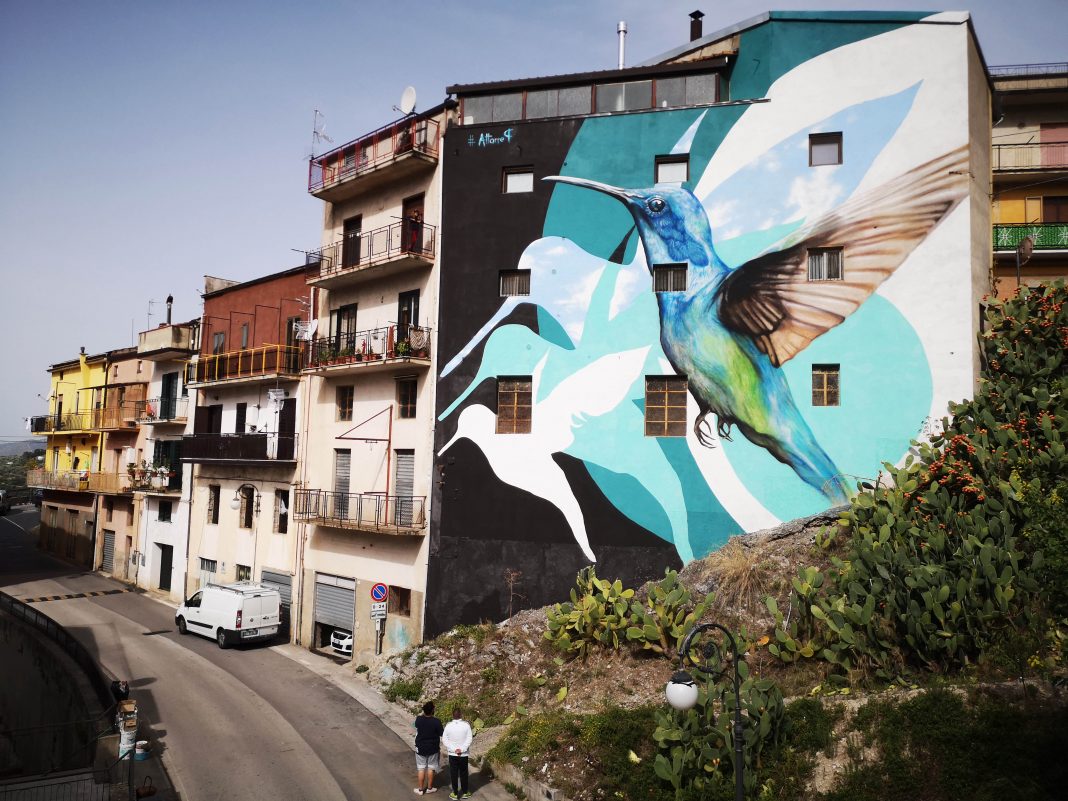 I due giovani e talentuosi artisti di questa seconda tappa di OSA Around sono anche fondatori e ideatori di due tra i più noti festival d’arte urbana della scena nazionale. Da una parte, Antonino Perrotta in arte Attorrep, artista adamantino, founder e art director del festival OSA – Operazione Street Art, che a Vietri lascia un messaggio di speranza e di forza verso il futuro che possa essere da augurio per tutti i giovani e per le generazioni future: “Un colibrì vola libero e leggiadro così come, spero, possano spiccare liberamente il volo i sogni personali, i progetti di vita, l’indipendenza e l’individualità di ognuno di noi. È un po’ come quello che sta accadendo in questo piccolo borgo, dove i giovani hanno già vinto il loro futuro” (Antonino Perrotta).