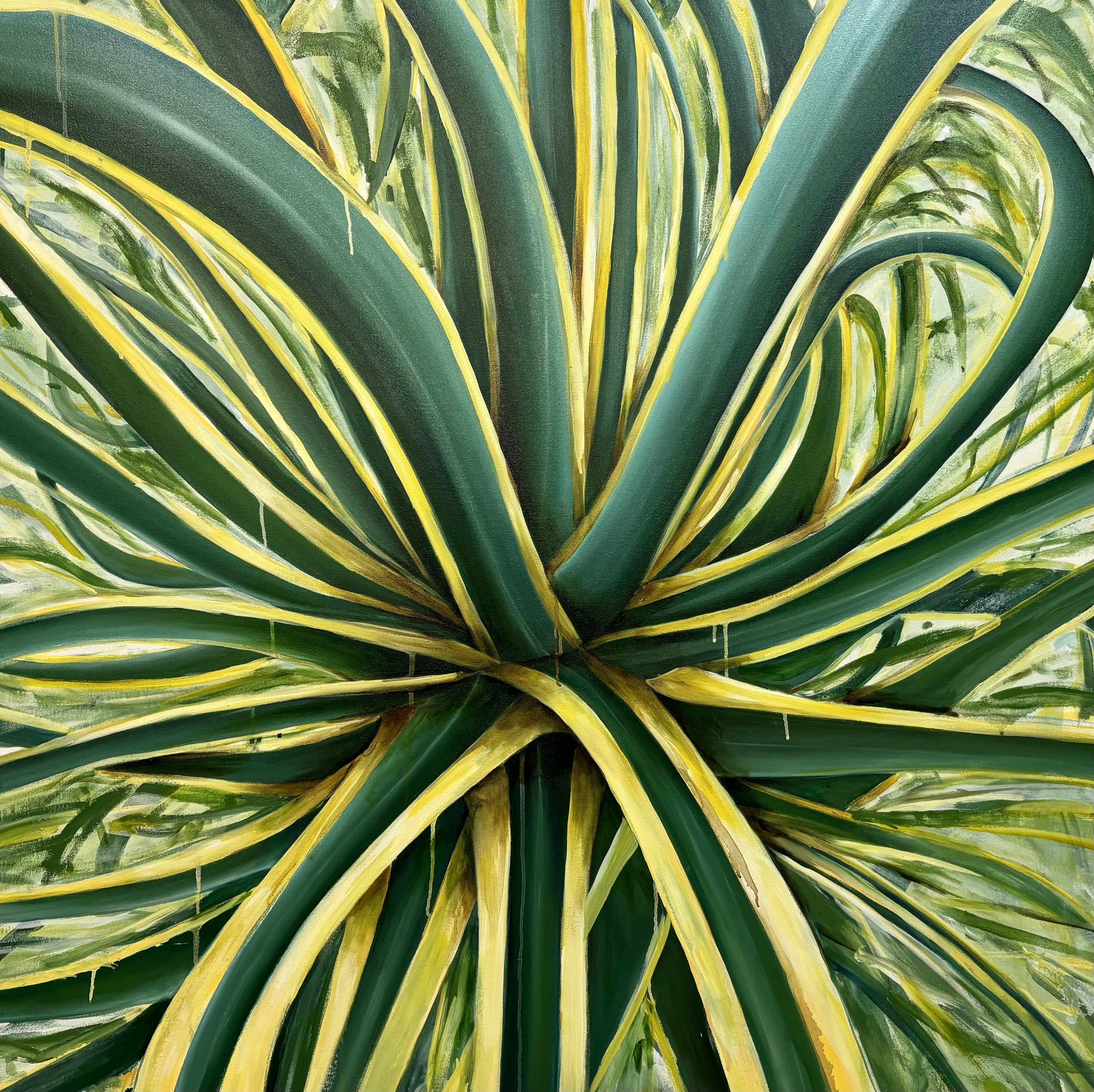 Il lavoro pittorico di Antonio Bardino entra in profondità nel soggetto naturale che rappresenta rispettandolo e al tempo stesso enfatizzandolo in una direzione di apparente iperrealismo. Presenti in mostra tele di grandi dimensioni che trasformano l’ambiente in una serra dove le foglie di agave viste in close-up si protendono fino ad uscire dallo spazio dipinto. È il caso, per esempio, dell’opera “Resistenze”, un olio su tela del 2024 in cui Bardino si avvicina e avvicina lo sguardo dell’osservatore al soggetto vegetale, che prorompe con tutto il suo vitalismo, volendosi spingere oltre i margini della tela. È un’immagine che però contiene un’ambiguità: davanti al dato naturale l’artista interviene moltiplicando l’articolazione delle foglie con un intento deliberatamente artificioso. L’autore si spinge in direzione di una reinvenzione della realtà rappresentando un soggetto naturale che sconfina paradossalmente in una dimensione antinaturalistica.