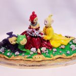 Nelle mani di De Molfetta la ceramica, tecnica solitamente austera, sprigiona una fantasia fuori controllo. La scultura si fa gioco, da vedere e da toccare, ma a furia di spingersi fuori dalle regole prende anche un profilo vagamente inquietante. Come nelle tele di Bardino, anche nelle opere di De Molfetta il pubblico è chiamato a rapportarsi con una dimensione di un “troppo”, di un “fuori misura”. L’artista nei suoi lavori insinua un pizzico di follia come nella ceramica presente in mostra “Puffany & Co” dove su una zolla di prato, in un verde gonfio di erba troppo smaltato per essere reale, si consuma un bizzarro rito nel mondo dei Puffi.