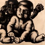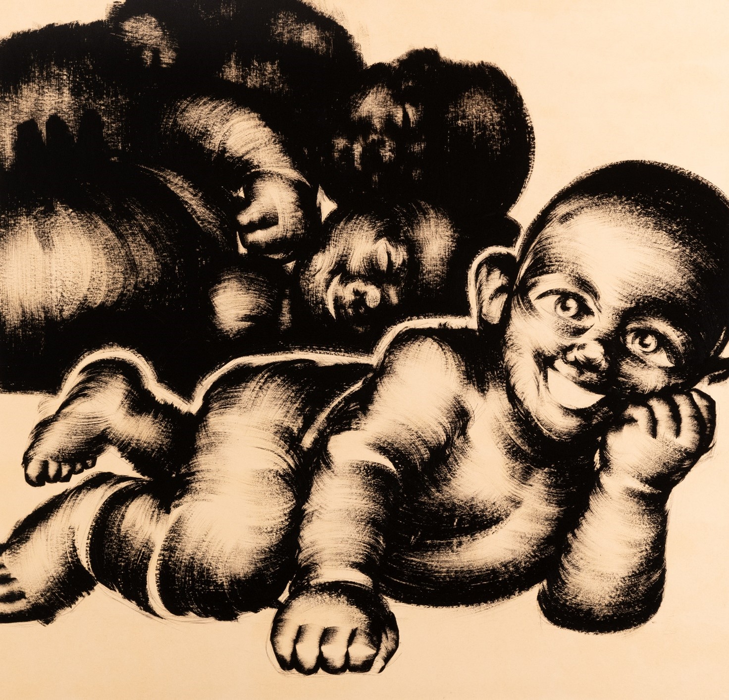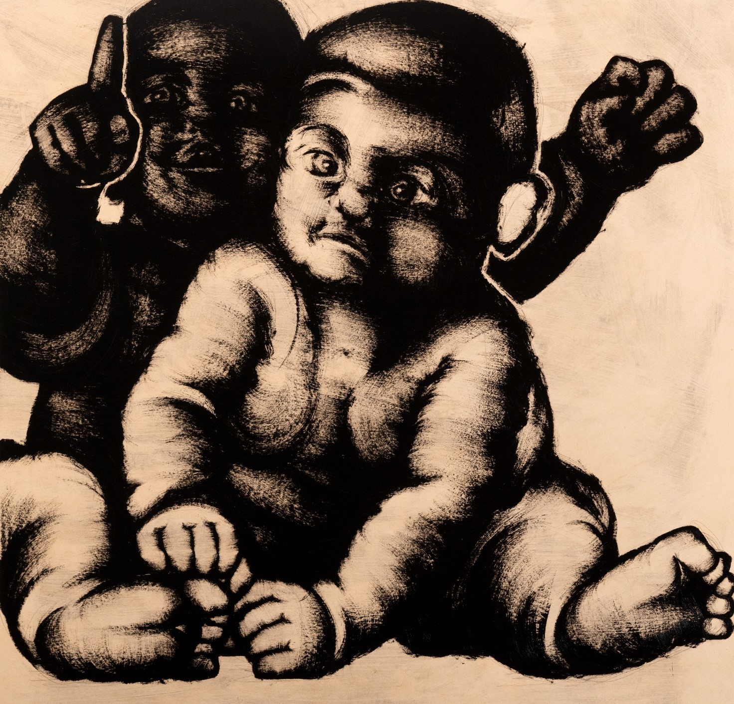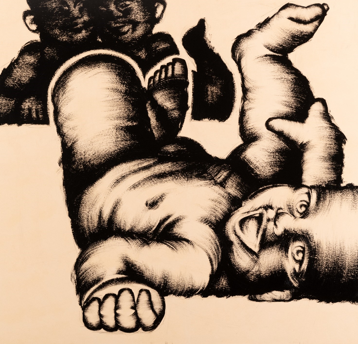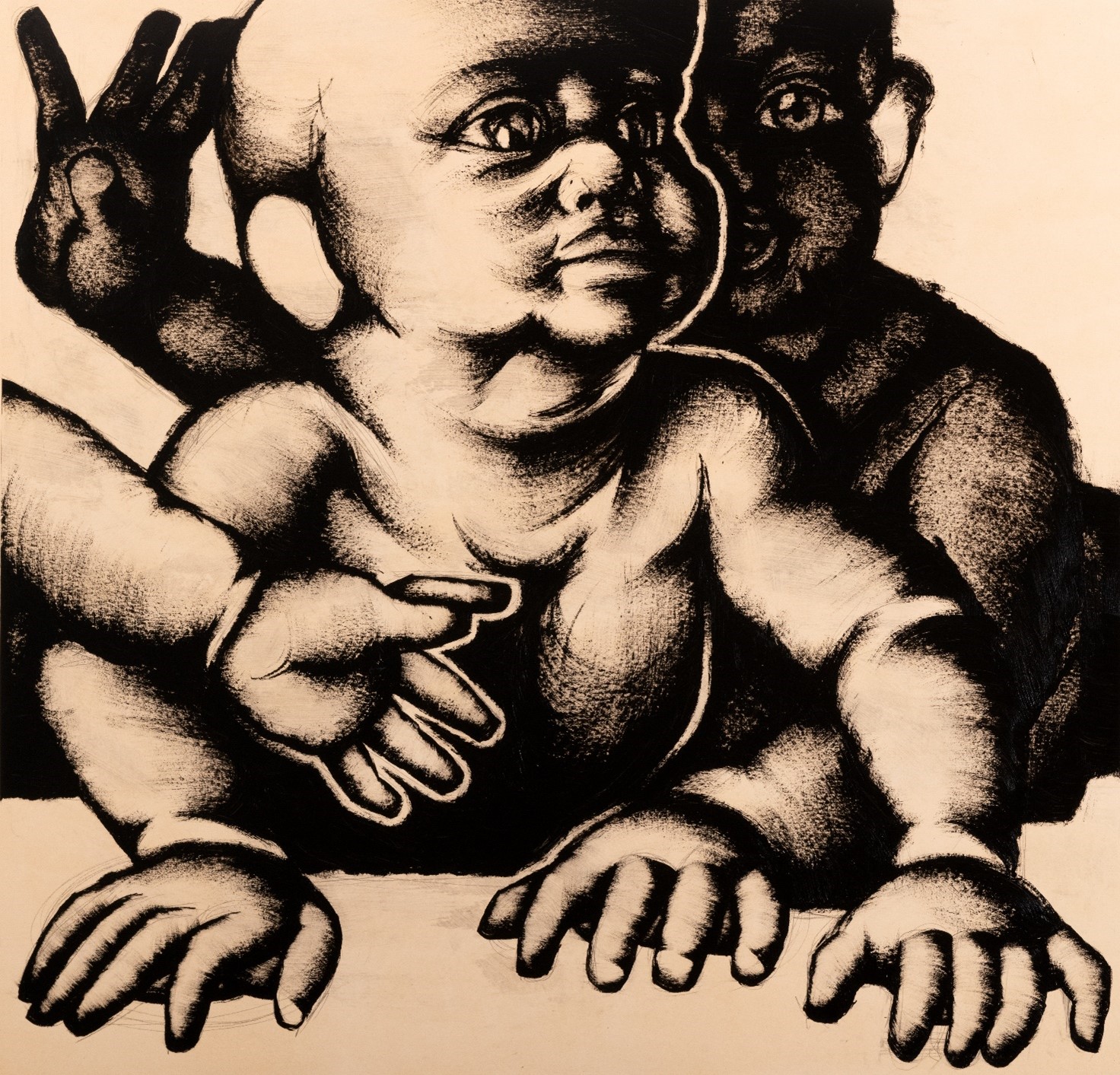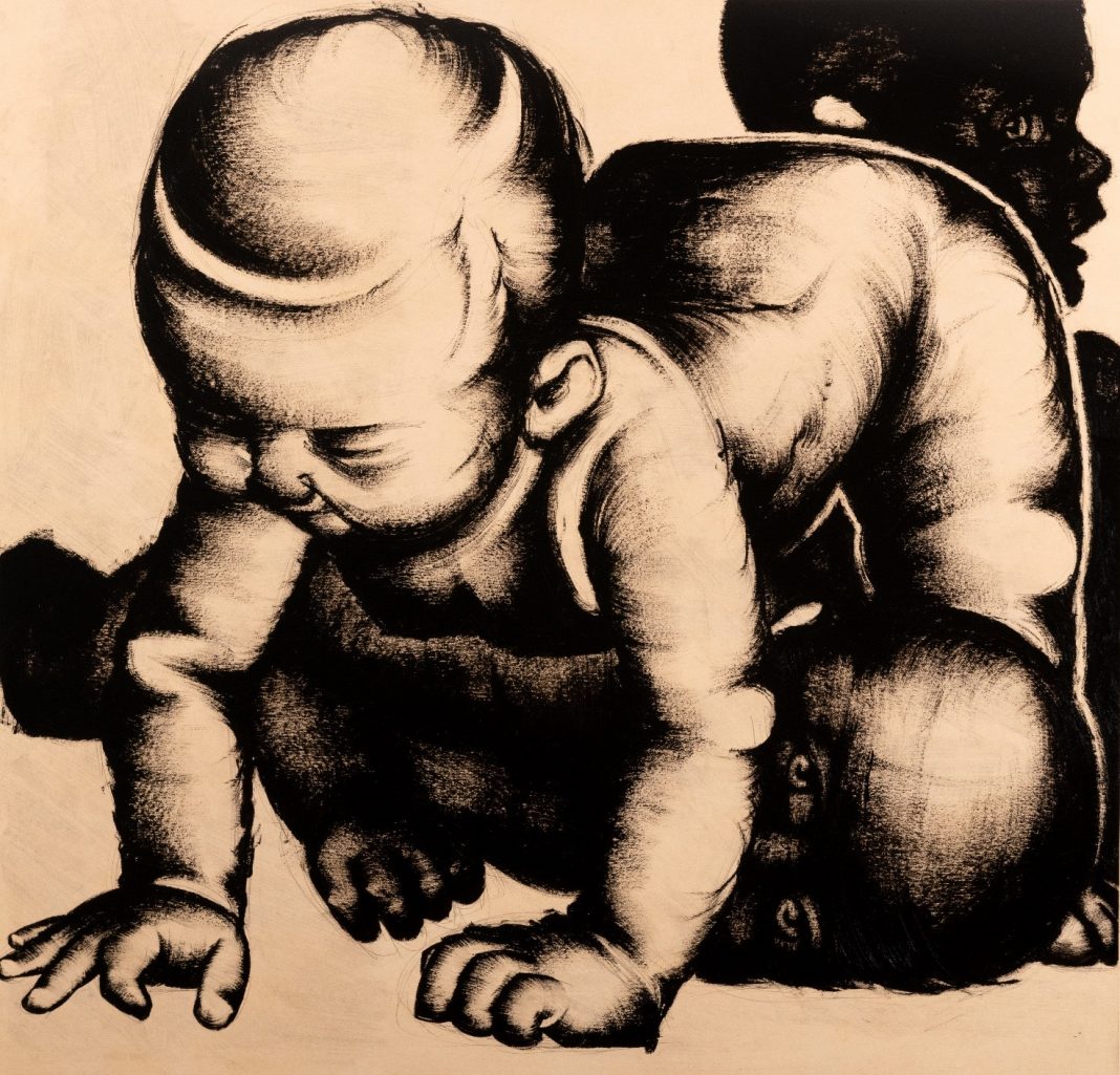 Lo stesso artista racconta di trovare ispirazione da maestri dalla forte carica drammatica ed espressiva quali Francis Bacon e Alberto Giacometti. Questa drammaticità viene da lui addolcita con sorrisi quasi beffardi che animano i suoi soggetti rappresentati infanti, spesso sorridenti, dall’espressione di adulto. Alcuni gattonano, altri sono già in posizione eretta ma dal passo ancora incerto. Il loro sorriso è solo apparente e inquietano lo spettatore in quanto non hanno una contentezza da bambino quasi ci fosse un marchio “genetico” che li ha resi già adulti nell’espressione nonostante non siano ancora cresciuti.