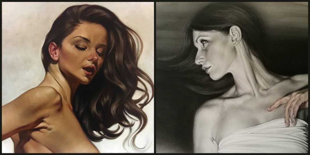 La tecnica pittorica magistrale dei ritratti e della figurazione di Antonio Caputo, classe 1976, risente dell’influenza del suo docente accademico Omar Galliani anche se i colori caldi di cui la sua opera è intrisa, ci riportano alla mente i muri degli affreschi pompeiani conditi con un ricordo manierista alla Bruno D’ Arcevia, da cui è stato per anni a bottega. Queste figurazioni si sposano con i bianchi e neri dei disegni iperrealisti di Cetti Tumminia, classe 1977.