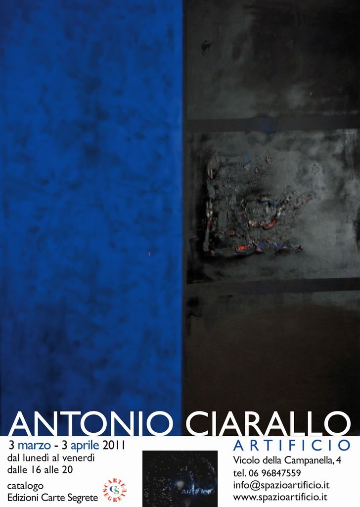 Antonio Ciarallo è un pittore perché la triade monocromatica della sua pittura, ovvero il bianco, il nero e il blu, sono momenti della sua vita e rappresentano luoghi della sua mente. Nessun incontro con Ciarallo dice dell’artista quanto l’incontro con la sua pittura. Che è pittura a tendenza monocromatica, come detto, e d’evocazione informale, come tanti altri hanno scritto occupandosi di lui, ma che, nello sostanza più profonda, è pittura-Ciarallo, è pittura con un nome proprio, il nome di chi la fa, essendola.”