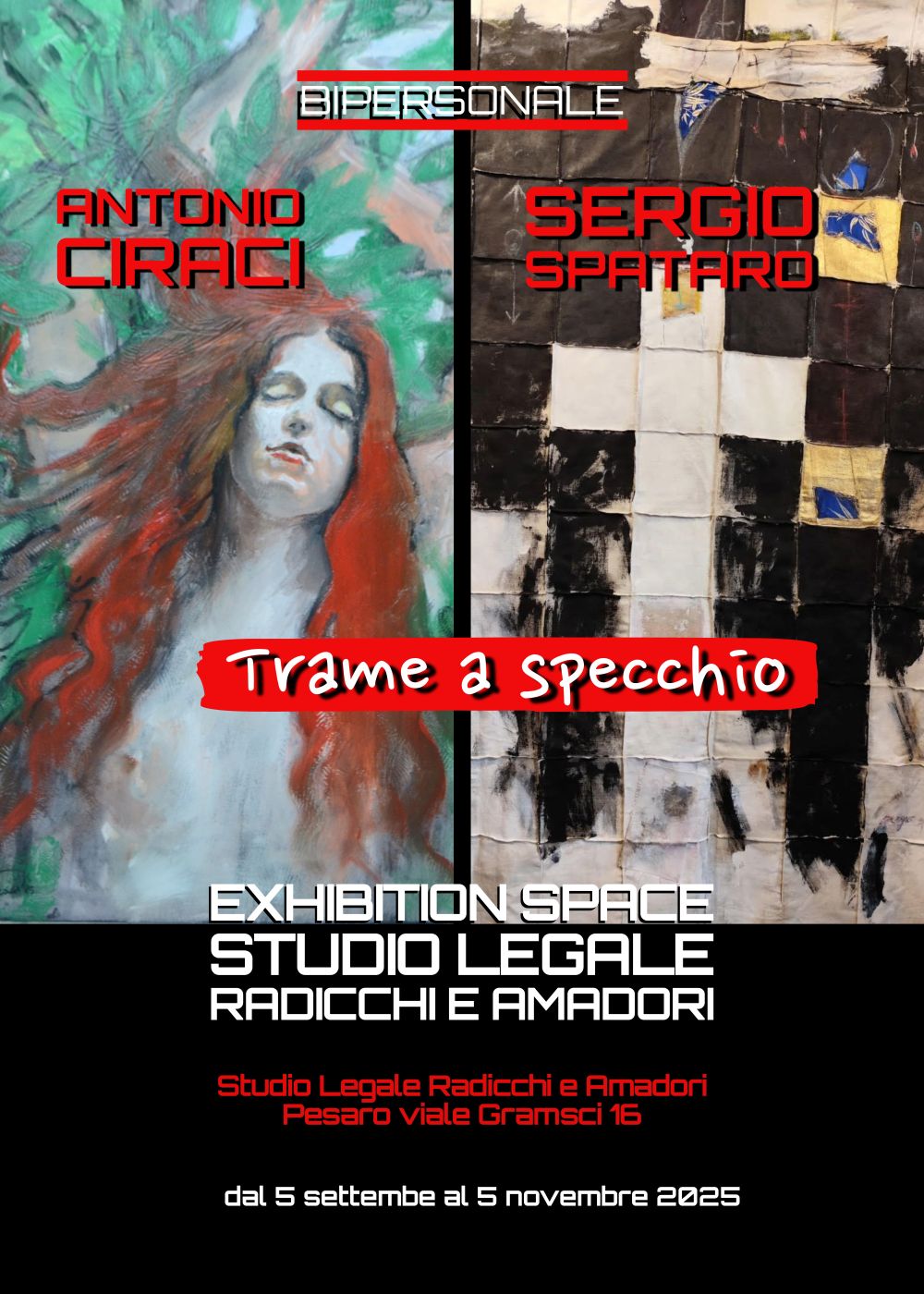 Dal 5 settembre al 5 novembre, lo studio legale Radicchi Amadori a Pesaro ospiterà le opere di Ciraci e Spataro, offrendo uno spazio espositivo suggestivo e raffinato che metterà in risalto la bellezza e la complessità delle loro creazioni. L'ambiente elegante e professionale dello studio legale si trasformerà in una cornice perfetta per accogliere le opere cariche di significato e di emozioni dei due artisti.