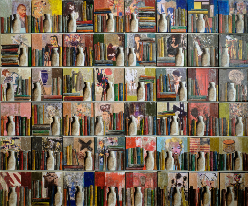 Ogni riquadro dell’opera presenta la riproduzione di un’opera iconica appartenente a 48 artisti fondamentali per la formazione di De Pietro, tra cui Sironi, Boccioni, Casorati, Fontana, Burri, Warhol, Duchamp. La costante visiva è data dalla presenza di una pila di libri e di un vaso con lettere, elementi che si ripetono con variazioni minime, suggerendo un’idea di continuità e stratificazione culturale.