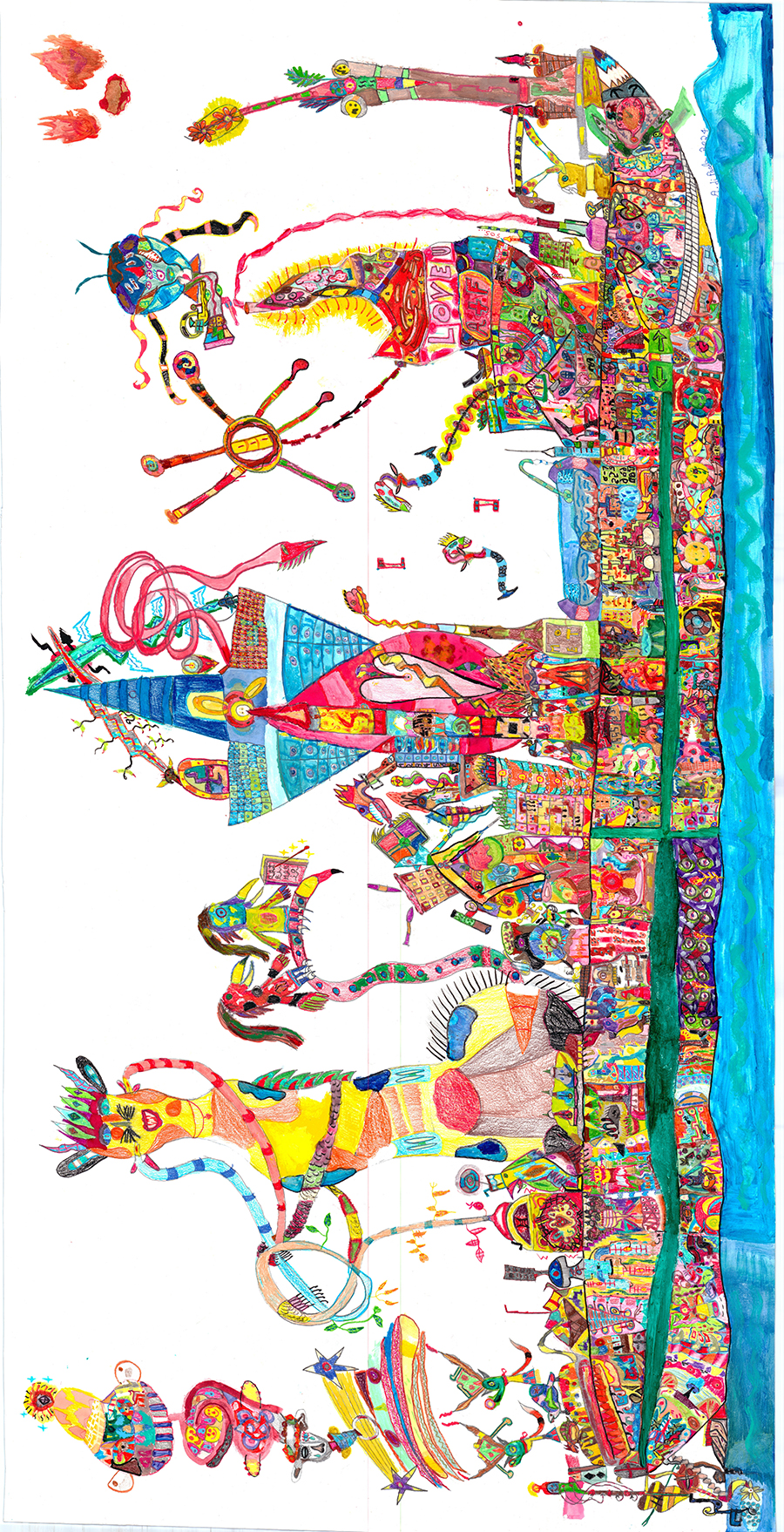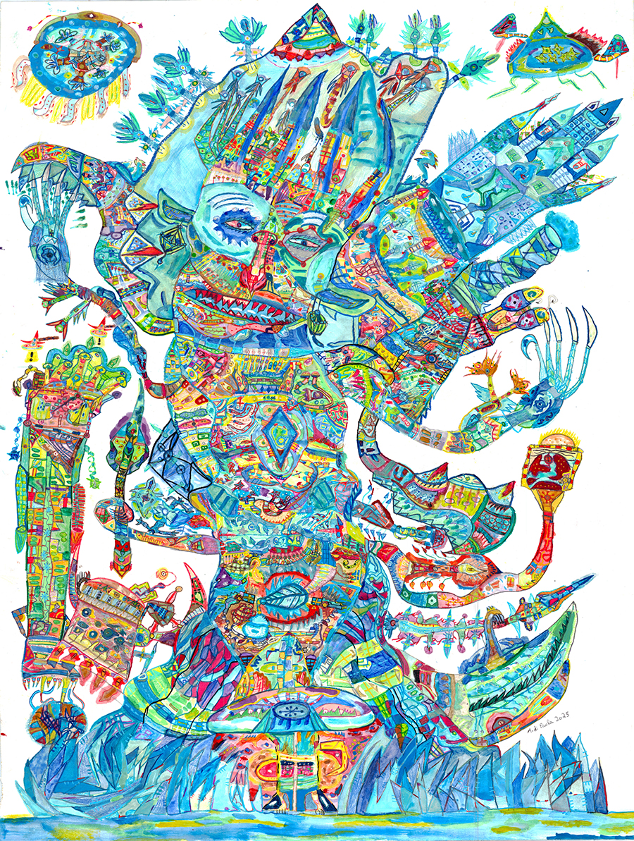 “Nel repertorio dell’artista – scrive di Stefano nel testo critico in catalogo – i colori hanno un loro valore simbolico, e se il blu è il ghiaccio, il rosso è il fuoco, la lava, il sangue della terra, mentre il giallo è la potenza, il verde è il veleno… L’effetto complessivo è giocoso, decorativo e allo stesso tempo inquietante. Persino virtuosistico, nell’uso combinato di tecniche miste, tra cui acquerello, acrilico, pastelli a olio, pigmenti ed ecoline”.