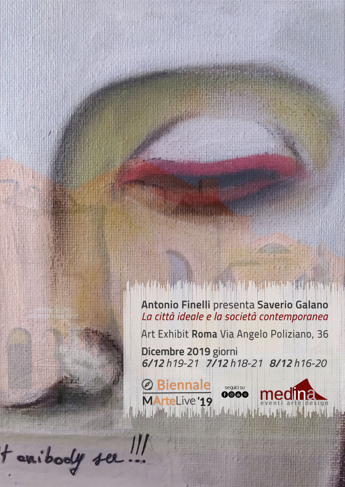 Dal 6 all’8 Dicembre presso gli spazi Medina Roma la mostra Antonio Finelli presenta Saverio Galano – La città ideale e la società contemporanea, che è parte della programmazione della Biennale MArteLive 2019 nell'ambito del progetto speciale Open Gallery. Due pittori estremamente diversi a confronto: da una parte la città ideale di Finelli dove tutto appare emblematico ed utopico e dove l’uomo non esiste, dall’altra parte il giovane Galano che rappresenta una società dove il silenzio interiore appare l’unica via di uscita dal caos che circonda l’uomo.