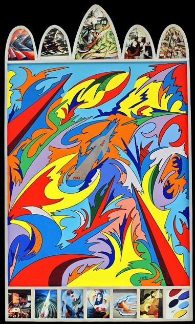 E infatti mentre con le 5 “citazioni” a collage (tecnica ispirata da Boccioni)(5) nelle cuspidi della parte superiore di Russolo (Dinamismo d’un’automobile, 1912-13), Balla (Velocità astratta, 1913), Boccioni (Stati d’animo: gli addii, 1911-12), Severini (Il treno Nord-Sud, 1912) e Carrà (Festa patriottica, 1914) e con le 7 della predella: Depero (La casa del mago, 1920), Dottori (Il trittico della velocità: b) In corsa, 1927), Peruzzi (Battaglia aeronavale, 1939), Prampolini (Figura nello spazio, 1937), Delle Site (Aerovelocità, 1935), Benedetto (Elettroni in moto, 1982) e Monachesi (Imponderabilità Agrà, 1979 ca.) il nostro ultimo futurista è riuscito a mettere tra parentesi verticali la sua “astronave” del centenario sfrecciante tra le esplosioni cromatiche del magma cosmico, quasi a voler sciogliere la condensazione del nome d’arte Ufagrà in un suggestivo “ufo” Agrà; nel trittico ha ottenuti connubi più dialettici, calando nel ribollente orografico orizzonte della propria pittura 3 collages, il primo di Balla (Velocità astratta, 1913), il secondo di Dottori (Primavera umbra, 1923) e l’ultimo il suo Battaglia cosmica n. 5 del 2006, i cui titoli semplificano appunto quello dell’opera.