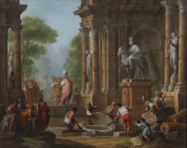Ma il pittore guardò all’ Urbs Romana anche come città antica, simbolo del mondo classico. Questa fu l’idea che sottese alla realizzazione delle diverse versioni del Campo vaccino e dei Paesaggio con ruderi dipinti, nei quali il pittore opera a metà tra capriccio e veduta.
