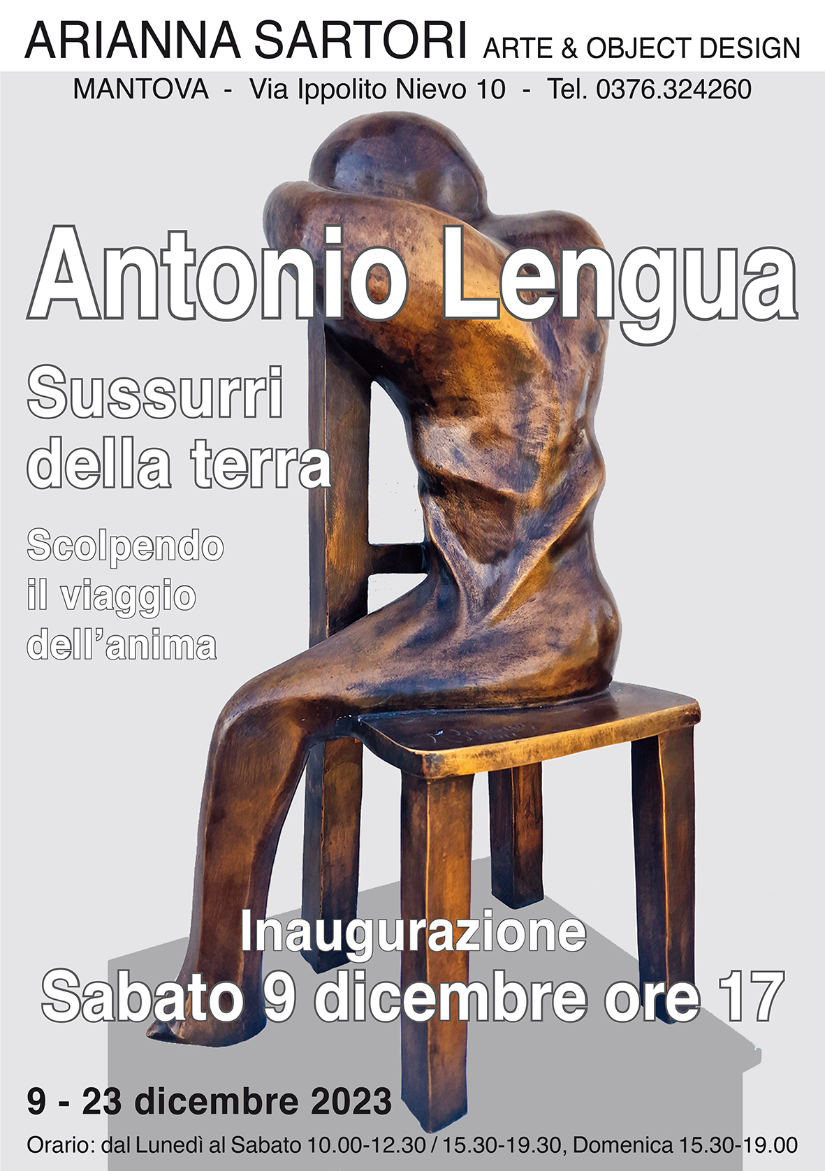 La Galleria Arianna Sartori di Mantova, nella sede di Via Ippolito Nievo 10, presenta l’Artista Antonio Lengua con la mostra intitolata “Sussurri della terra. Scolpendo il viaggio dell’anima”.