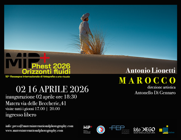 Giovedì 2 aprile 2026, alle ore 18:30, presso la Galleria Arti Visive di Matera, il MIP – Matera International Photography APS – ETS presenta MAROCCO di Antonio Lionetti, fotografo materano, con la direzione artistica di Antonello Di Gennaro. Il progetto espositivo si inserisce all’interno del MIPphest2026 – Orizzonti fluidi, 10° festival internazionale di fotografia e arti visive; confermando l’impegno più che decennale del MIP come hub culturale aperto e transdisciplinare, sviluppando progetti capaci di far dialogare culture e territori del Mediterraneo e d’Europa: nei quali la fotografia e le arti visive non sono solo veicoli espressivi, ma veri e propri strumenti di esplorazione concettuale, che pongono l’uomo come fulcro dell’osservazione e dell’indagine critica. La fotografia non è semplicemente produrre o mostrare immagini, ma è un medium, un linguaggio artistico contemporaneo attraverso cui ci si interroga sul presente, si esplorano prospettive e si stimola sguardi consapevoli creando un dialogo tra territori, culture, tradizioni, religioni, mettendo al centro temi contemporanei come migrazioni, crisi ambientali, inclusione sociale e trasformazione digitale.