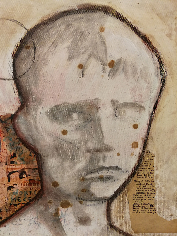 La tecnica scelta dall’artista è perfetta per esprimere questo senso di stratificazione: ampie campiture cromatiche si alternano e sovrappongono a volti dipinti con pochi semplici tratti su fondi giallo ocra, come in affreschi corrosi dal tempo e caratterizzati da tratti primitivi ma al tempo stesso perfettamente contemporanei.