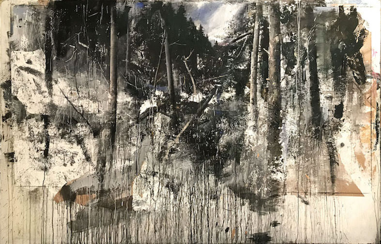 Nella serie esclusiva di 10 opere verticali che vogliamo definire per soggetto, bianchi periferici, allestite come una serie di frame cinematografici una accanto all’altra, l’equilibrio di forze della natura è il filo conduttore, dove la morsa della neve scesa dall’alto, si contrappone alla forza ascensionale della rigenerazione della vita e degli alberi. La morsa della neve non è meno potente della forza della materia, dove la pittura è macerata, rigirata e impastata direttamente sulla tela, che si contrappone alla linearità della carta inserita come se fosse materia pittorica.
