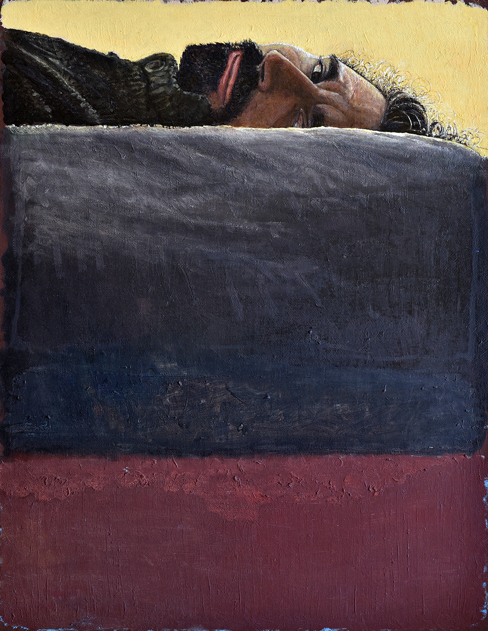 In “Pranzo a San Barnaba”, dopo aver ammirato i dipinti di Tintoretto, Jacopo Bassano e Paolo Veronese, Antonio Russo recupera un’iconografia immediatamente riconoscibile, “L’Ultima Cena”, che traspone nella sua quotidianità: un pranzo qualunque nella propria abitazione dalla cui finestra si vede la chiesa di San Barnaba del quartiere Prenestino-Labicano e lui in completa solitudine - all’epoca imposta dalle limitazioni dell’emergenza Covid - che si ritrae in differenti azioni/reazioni. I personaggi ritratti, ovvero lo stesso artista raffigurato in vari momenti, si muovono in maniera concitata, sembrano partecipare attivamente e dialogare tra loro; in verità non fanno altro che restare intrappolati nell’impossibilità di un’effettiva comunicazione. Un episodio circoscritto ed autobiografico, quindi, che potremmo leggere anche in chiave universale come una scena densa di quella solitudine esistenziale che può attraversare ognuno di noi.