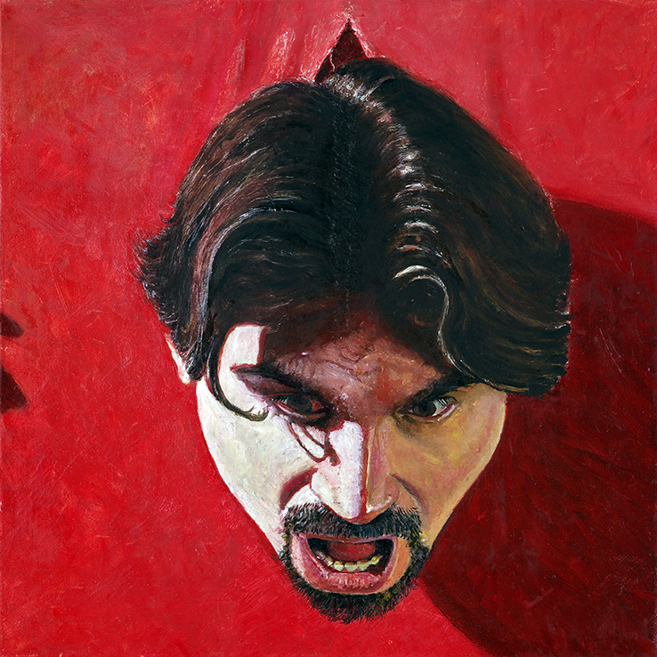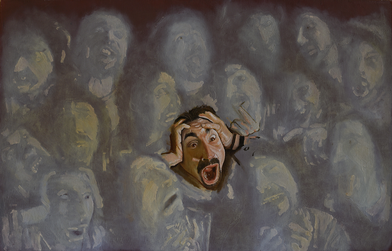 Potremmo concepire come una “autobiografia per immagini” la selezione dei lavori di Antonio Russo in mostra; l’artista inserisce se stesso, a volte si moltiplica con ossessione, nei vari dipinti ad olio e tempera, eleggendosi così indiscusso protagonista oltre che autore delle opere.