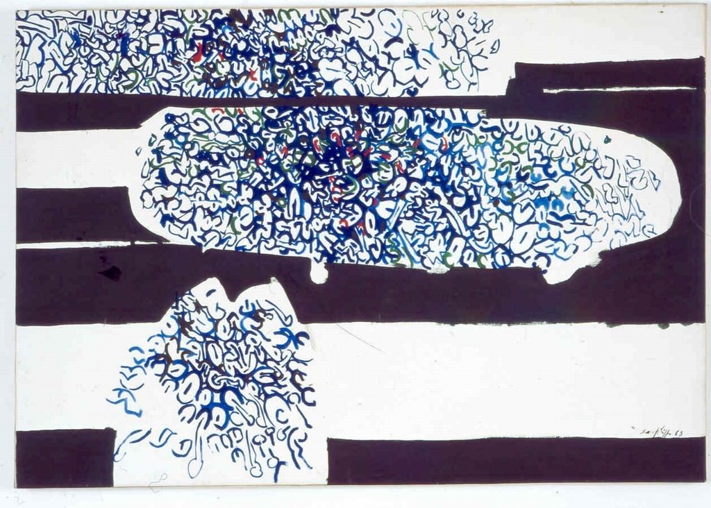 Scrive D’Amico in catalogo : “ Tra ’61 e ’66 si dispiega un’età in cui la pienezza finalmente raggiunta dei riscontri pubblici gli consente una molteplicità di approdi formali che finiscono per caratterizzare il periodo: donandogli una mobilità di ricerca sino ad allora come posta in sordina. Le grandi colonne oscure, fittamente tramate dai colpi ansiosi del pennello, bianchi e neri scritti con foga su fondi saturi e minacciosi, che avevano condotto Sanfilippo, sul finire degli anni Cinquanta, ad un sol passo da una condivisione dell’emotività turbata del nostro informale, lasciano ora il posto a una nuova individuazione del segno come fonema plastico a lui essenziale”.