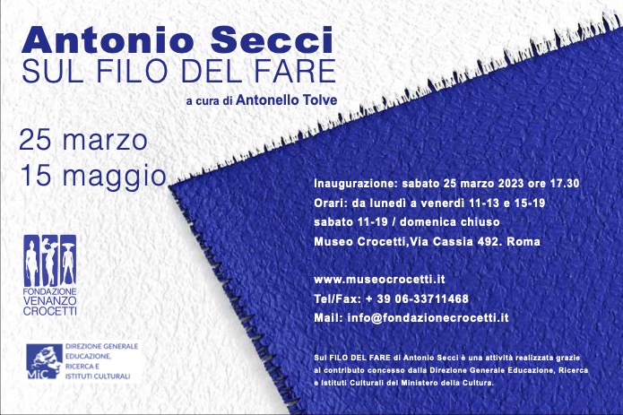 SUL FILO DEL FARE di Antonio Secci è visitabile fino al 15 maggio 2023 ed è realizzata grazie al contributo concesso dalla Regione Lazio - Direzione Regionale Cultura e Lazio Creativo | Area Servizi Culturali e Promozione della Lettura.